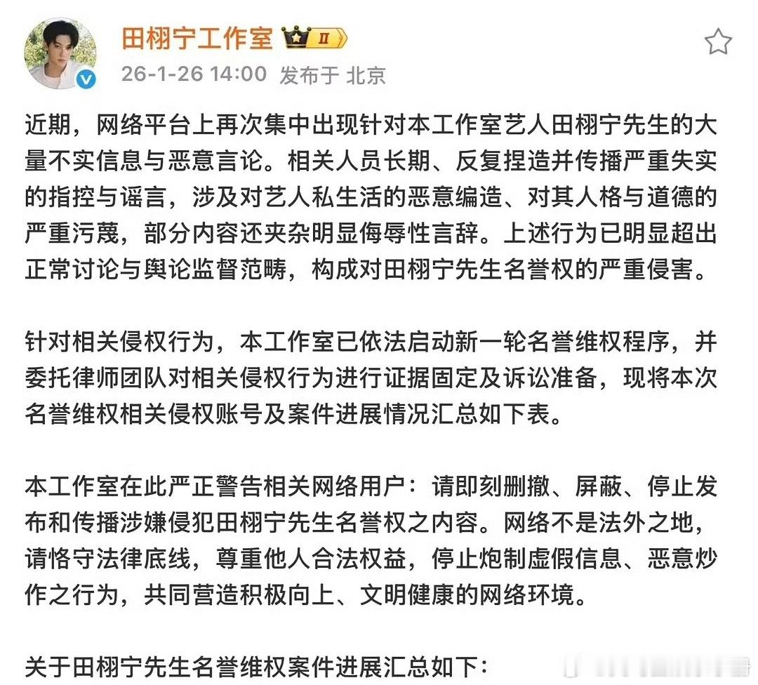 田栩宁工作室维⭕,发布告黑进展田栩宁工作室发告黑进展