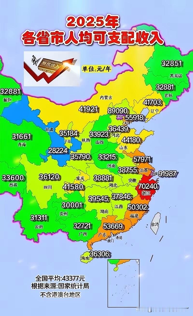 真是让人想不到!2025年全国居民人均可支配收入数据出炉,着实让人有些意外,全国31个省市中,仅有8个省市的人均可支配收入超过了全国平均水平43377元。 这意味着有多达23个省市在此标准之下,区域间的收入差距可见一斑。在这8个达标省市中,除了北京,其余均为沿海省份,不禁让人感叹沿海地区的经济优势果然明显。 上海以其雄厚的经济实力,拔得头筹,2025年人均可支配收入突破9万元大关,达到91987元。北京也毫不逊色,以89090元紧随其后。 浙江则是除直辖市外的第一名,人均可支配收入为70240元,成功跨越7万元关口。这三地宛如经济领域的“三驾马车”,领跑全国居民收入第一梯队。 再看4个直辖市,上海一马当先,成为直辖市中的“收入冠军”,而重庆相对而言则处于末尾。上海的人均可支配收入是重庆的2.2倍左右,这差距不可谓不大。 上海作为国际化大都市,金融、贸易、科技等产业发达,宛如一颗璀璨的东方明珠,吸引着全球的人才和资本,居民收入自然水涨船高。 而重庆虽也是直辖市,但地域广阔,人口众多,经济发展的均衡度与上海相比还有提升空间,这也在一定程度上影响了居民的整体收入水平。 5个自治区中,内蒙古脱颖而出,人均可支配收入位居榜首,广西则相对较低。内蒙古凭借丰富的自然资源和不断发展的农牧业、工业等产业,居民收入稳步提升,其人均可支配收入是广西的1.28倍左右。 广西虽然拥有独特的地理位置和丰富的旅游资源,但在产业发展的深度和广度上,或许还需要再加把劲,才能让居民的钱包更鼓起来。 在23个省中,浙江无疑是“佼佼者”,以70240元的人均可支配收入位居第一,而甘肃则处于末端,人均可支配收入相对较低。 浙江是民营经济的热土,中小企业如繁星点点,遍布全省,创业氛围浓厚,无论是制造业还是电商等新兴产业,都发展得如火如荼,带动了居民收入的大幅增长。 反观甘肃,地处内陆,自然条件相对复杂,经济发展面临诸多挑战,其人均可支配收入仅为浙江的约四成,约28224元,两者差距达到了2.48倍左右。 这也让我们看到,地区经济发展的差异,切实影响着居民的“钱袋子”。这种收入差距的存在,背后原因是多方面的。 沿海省份凭借其优越的地理位置,便于发展对外贸易和海洋经济,早早地搭上了经济快速发展的列车。 而内陆地区,尤其是一些自然条件较差、交通不便的地方,经济发展起步相对较晚,产业基础薄弱,居民增收渠道相对狭窄。 就像一句老话所说:“巧妇难为无米之炊”,没有良好的经济基础和产业支撑,想要提高居民收入,谈何容易? 不过,我们也应该看到,近年来,随着国家一系列区域协调发展战略的实施,如西部大开发、中部崛起等,不少中西部地区的省市正在迎头赶上。 一些曾经的经济“洼地”,如今也逐渐涌现出一个个产业园区,企业纷纷入驻,就业机会增多,居民收入也在稳步提升。 例如内蒙古、重庆、湖南等中西部地区省份,在2025年的人均可支配收入在中西部地区中就位居前列,它们正以自己的节奏,书写着经济发展和居民增收的新篇章。 收入差距的存在是现实,但这并非不可改变。“穷则变,变则通,通则久”,每个地区都有自己的优势和潜力,只要找准发展方向,因地制宜地发展产业。 加强教育、科技投入,提升居民素质和技能,相信无论是沿海还是内陆,无论是直辖市、自治区还是省,都能让居民的人均可支配收入不断提高,让更多的省市能够跨过全国平均水平这条线,让老百姓的生活越来越富足,让“钱袋子”越来越鼓。 毕竟,只有居民收入普遍提高了,才能真正实现经济的高质量发展,才能让全体人民共享发展成果,向着共同富裕的目标不断迈进。 2025年的人均可支配收入数据,是一份“成绩单”,既有让人欣喜的地方,也有值得我们思考和努力的方向。 未来,随着各地经济的持续发展和政策的不断发力,我们有理由相信,全国各省市的居民收入将会不断提升,收入差距也会逐渐缩小,届时,或许会有更多的省市能够自豪地说:我们超过全国平均水平了!