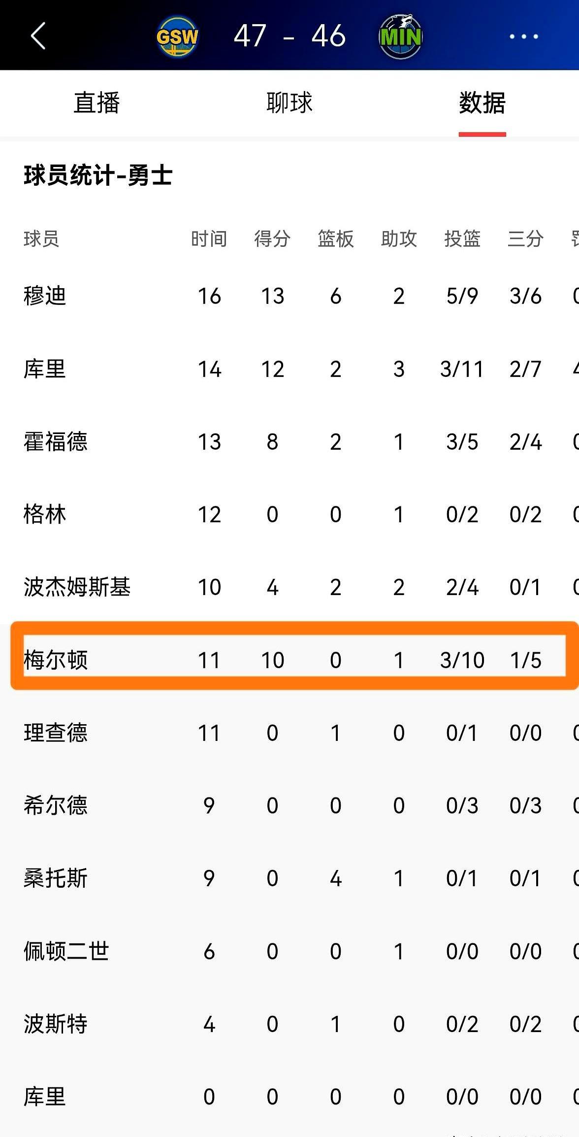 勇士替补只剩他还能得分 上半场47比46,比分像冻住。 梅尔顿拎着11分
