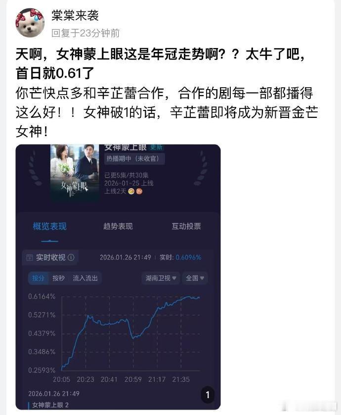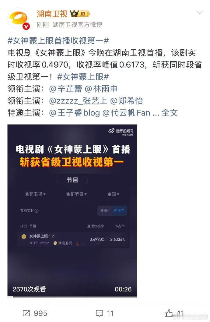 辛芷蕾律政剧女神蒙上眼昨晚湖南卫视首播,第二集收视酷云破0.61,芒果精已经开始夸辛芷蕾了。但部分网友说是现在打播剧环境竞争力太弱了,反哺卫视收视率。你怎么看?