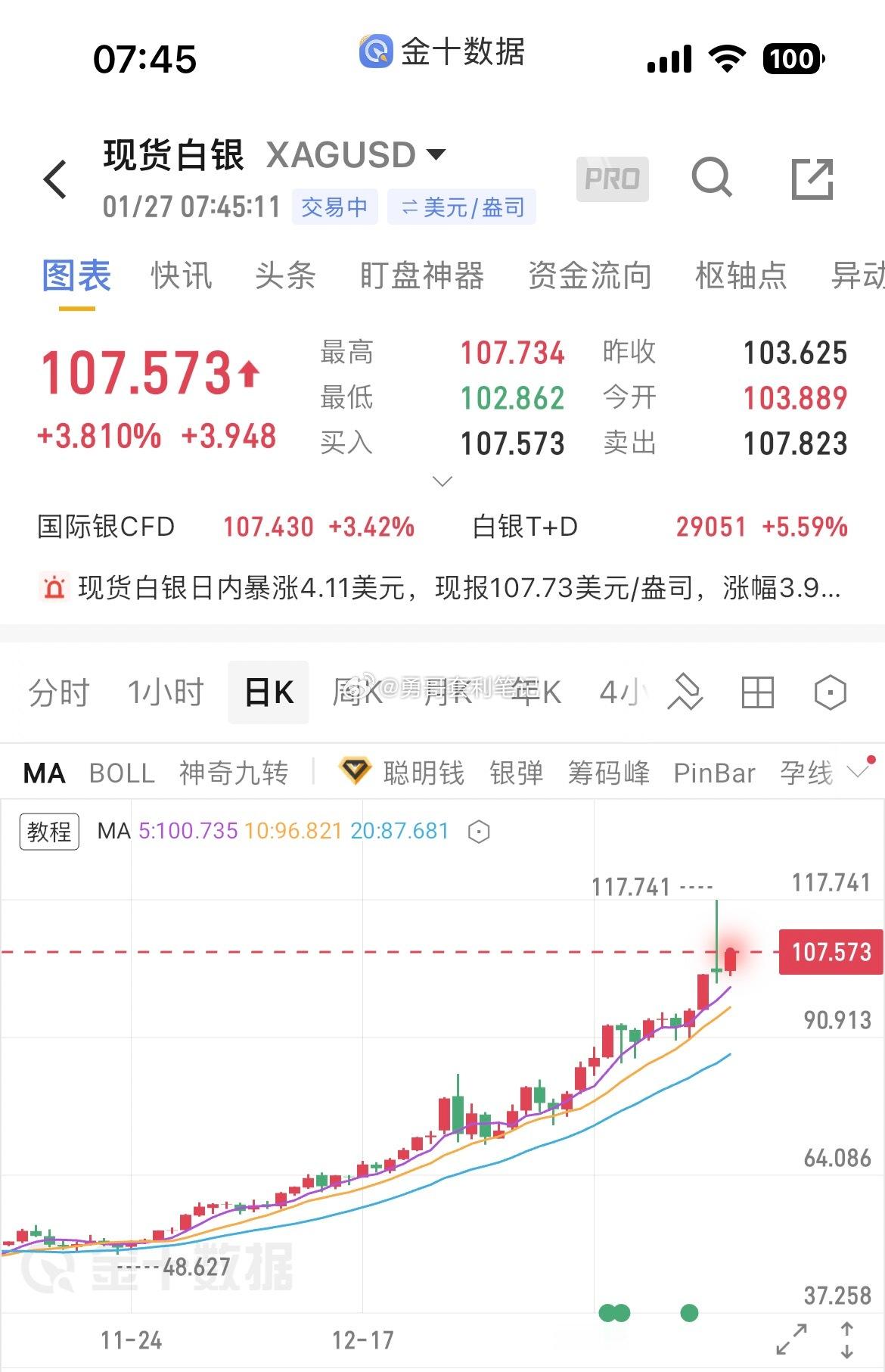 现货白银抹去14%涨幅现货白银最高118美元/盎司,元旦后已涨超50%啦,人民币26.33元,我在25.3元再次减仓一成仓位,上次21元买的,计划每涨一元卖出一成仓位的,涨势如虹,惜售了,卖出就买不回来了