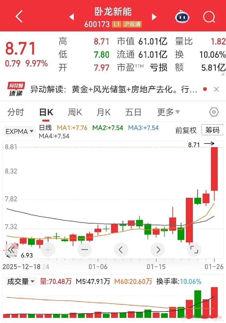 大位科技,前期有过一段堆量连阳,后连续四天回调。回调跌破第一道生命线,在线下两天,第三天回到线上,缩量三连阳的红三兵后,昨天开盘后秒板,中途有两次炸板后,还是稳稳封住涨停至收盘。换手率13.84%,量能还算正常。卧龙新能,转型为矿产资源类,涨停后横盘两天,再次涨停,属于尾盘拉升,此涨停有偷袭之嫌。特别提醒:贴图欣赏,并非推荐,据此操作,风险自担。✦✦✦本人仅此一号,不主动加人,主动加人者是骗子。请提高警惕,否则损失自负。✦✦✦