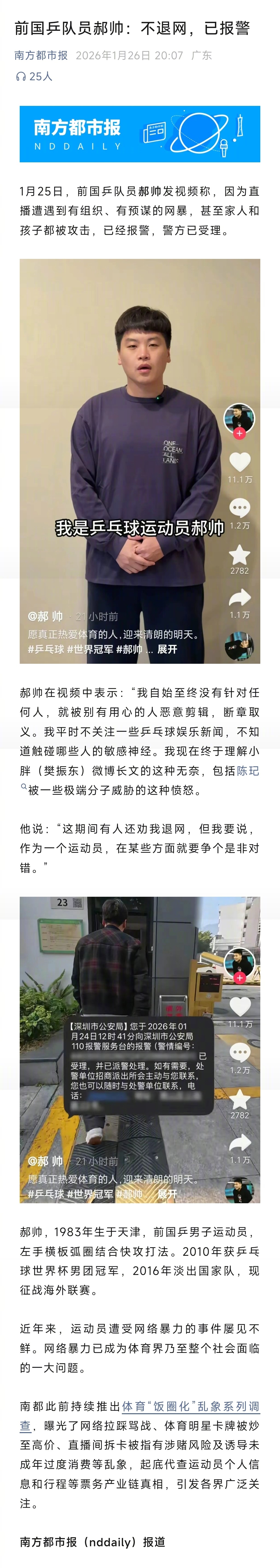 #前国乒队员郝帅遭网暴#【前国乒队员郝帅:不退网,已报警】#前国乒队员郝帅报警#1月25日,前国乒队员郝帅发视频称,因为直播遭遇到有组织、有预谋的网暴,甚至家人和孩子都被攻击,已经报警,警方已受理。郝帅在视频中表示:“我自始至终没有针对任何人,就被别有用心的人恶意剪辑,断章取义。我平时不关注一些乒乓球娱乐新闻,不知道触碰哪些人的敏感神经。我现在终于理解小胖(樊振东)微博长文的这种无奈,包括陈玘被一些极端分子威胁的这种愤怒。他说:“这期间有人还劝我退网,但我要说,作为一个运动员,在某些方面就要争个是非对错。”郝帅,1983年生于天津,前国乒男子运动员,左手横板弧圈结合快攻打法。2010年获乒乓球世界杯男团冠军,2016年淡出国家队,现征战海外联赛。