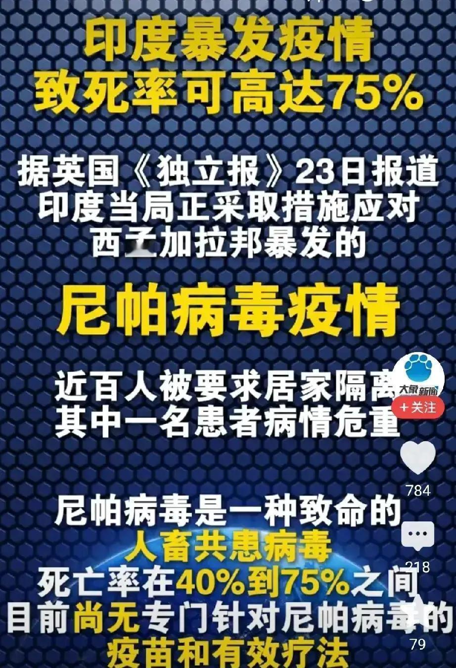 印度发现尼帕病毒又上热搜,大家一下子紧张了起来。 尼帕病毒不是新名字,世卫组织早就列为重点监测病毒之一,过去在南亚多次出现过疫情,人传人风险和较高死亡率也都是公开写在报告里的,但目前并没有像新冠那样在全球大范围暴发。 很多人一看“死亡率45%-70%”就联想到当年的新冠,其实两者传播特点不同,新冠在春节那年已经在多地社区持续传播,而尼帕目前更多还是局部散发,是否扩散要看当地防控和流动规模。 对我们来说,更现实的事是:边境检疫、机场口岸健康申报、疑似病例隔离,这一整套流程在新冠后已经比较成熟,只要执行到位,“第二个新冠”的概率就要看境外疫情发展和输入力度。 普通人也不是毫无办法,口罩、勤洗手、少去密闭人群聚集地,再加上规律作息、别熬夜掉抵抗力,这些看着普通的小动作,往往比恐慌更有用。 关键问题还是回到那句老话:这种“高致死、相对没那么易传播”的病毒,未来几年会不会因为国际旅行增多而改变面貌?你觉得个人防护、信息透明、还是国家口岸管控,哪一项更该排在第一位?