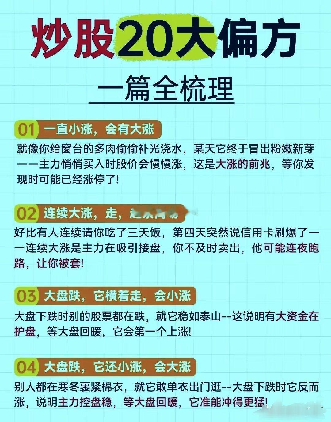 偏方治大病,炒股用上偏方也能有奇效。炒股20大偏方全集,慢慢体会,融会贯通就能芝麻开门,无往而不利,平步青云,开启财富自由的起点。没有失败,只有暂时的不成功。大道至简,说白了其实就三条:成交量、均线、和趋势。看懂了,你只需要做一件事情,找一个上升趋势的股票,买入,安安静静的等它到巅峰,下车。决胜巅峰