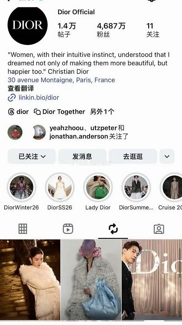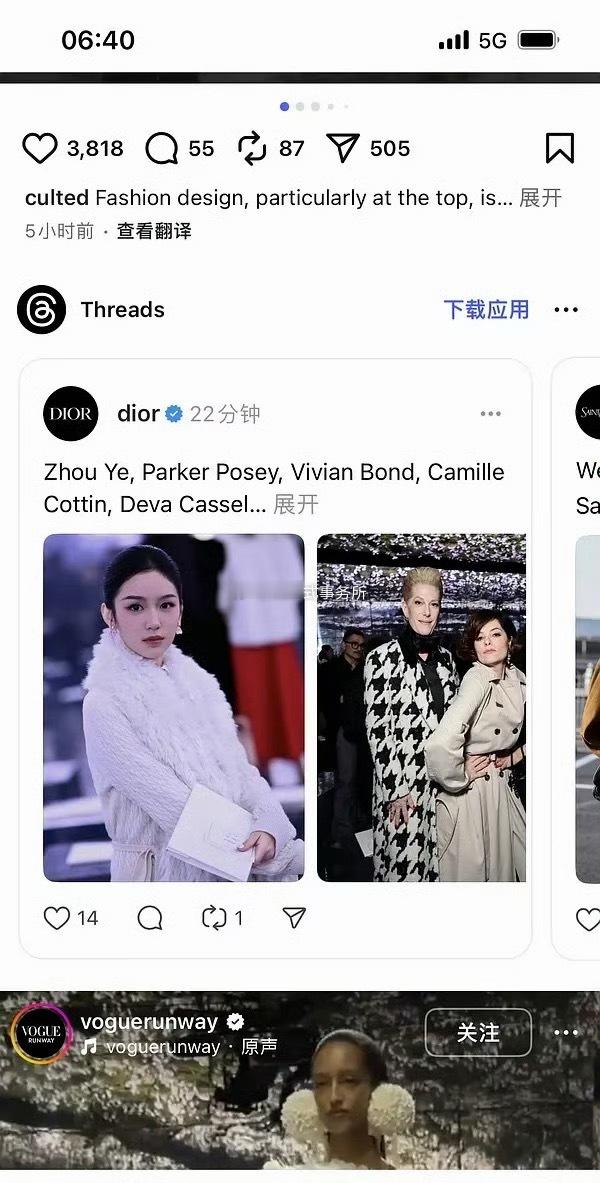 周也是Dior此次高定秀全球首位转发推特也只发了五个艺人包括周也,其他的全是大咖