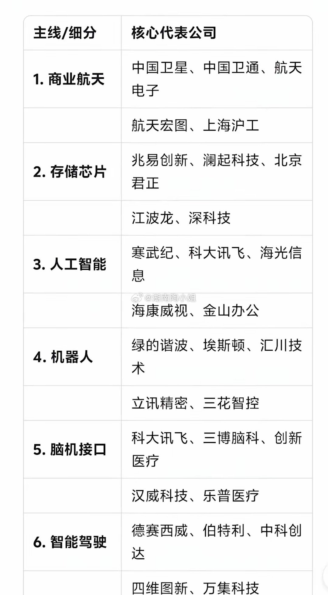 春节前布局地图:六条硬核主线,30家核心公司全梳理春节前最后几个交易日,市场看似热闹,但主线轮动加快。与其在噪声中追逐,不如静下心来,看清资金真正扎根的“硬核”方向。我们为您梳理了当前最具政策支撑与产业趋势的六大赛道,及其各环节不可绕开的30家标杆公司。这或许是你布局开年的关键参考。一、商业航天概念 ☆☆☆☆核心逻辑:国家战略级赛道,卫星互联网组网加速,进入订单爆发期。中国卫星:卫星制造绝对龙头,核心平台提供商。中国卫通:卫星通信运营国家队,掌握稀缺轨位资源。航天电子:火箭测控与星载电子核心配套。航天宏图:遥感卫星应用与服务龙头。上海沪工:被市场誉为卫星量产“超级工厂”。二、存储芯片概念 ☆☆☆☆核心逻辑:行业周期反转,涨价趋势明确,国产替代加速。兆易创新:存储芯片设计龙头,NOR Flash全球领先。澜起科技:内存接口芯片全球龙头,受益DDR5升级。北京君正:车规存储芯片绝对龙头,壁垒极高。江波龙:存储模组双雄之一,品牌与渠道优势强。深科技:存储封测标杆企业,技术领先。三、人工智能概念 ☆☆☆核心逻辑:从模型竞争走向应用落地,寻找能创造收入的场景。寒武纪:AI芯片算力核心,代表国产高端算力方向。科大讯飞:认知智能与AI应用龙头,“星火”大模型持续迭代。海光信息:国产CPU/DCU算力标杆,信创市场核心。海康威视:AIoT全球领导者,赋能千行百业智能化。金山办公:办公软件AI化龙头,产品重塑空间大。四、机器人概念 ☆☆☆☆核心逻辑:人形机器人产业化元年,核心零部件先行。绿的谐波:谐波减速器绝对龙头,机器人关节核心。埃斯顿:工业机器人国产龙头,全产业链布局。汇川技术:伺服系统与驱控一体化标杆,工控王者。立讯精密:消费电子龙头,被市场视为人形机器人整机组装潜在巨头。三花智控:人形机器人热管理+执行器双核心供应商。五、脑机接口概念 ☆☆☆☆核心逻辑:下一代人机交互平台,从医疗康复走向消费电子。科大讯飞:AI算法+脑电信号解码龙头,非侵入式路径领先。三博脑科:临床应用与手术落地标杆,渠道价值独特。创新医疗:侵入式脑机接口先锋,技术路径激进。汉威科技:柔性传感器核心供应商,感知层关键。乐普医疗:无创脑机接口康复龙头,医疗器械背景深厚。六、智能驾驶概念 ☆☆☆☆核心逻辑:L3级准入破冰,智能化配置率提升,产业链受益明确。德赛西威:智能驾驶域控制器绝对龙头,卡位最准。伯特利:线控制动系统标杆,国产替代核心。中科创达:车载操作系统与中间件隐形冠军,软实力突出。四维图新:高精地图核心玩家,数据壁垒高。万集科技:激光雷达+车路协同量产先锋。结语:这六条主线,共同勾勒出中国高端制造与科技创新的主干图。它们并非短期热点,而是具有长期产业生命力的赛道。本文基于公开信息与产业逻辑梳理,所提及公司不构成任何投资建议。市场有风险,投资需谨慎。