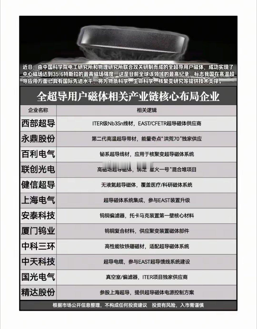 35.6特斯拉破纪录!全超导磁体能否让中国领跑下一代科技革命?当中国科学院联合团队宣布全超导用户磁体实现35.6特斯拉的全球最高磁场时,这个冰冷的技术数字背后,正涌动着一场改变人类未来的产业风暴。这不仅是中国高温超导应用跻身国际先进行列的里程碑,更标志着我们在核聚变、量子计算等“卡脖子”领域,终于拥有了自主可控的核心支撑。从托卡马克装置的“人造太阳”到生命科学的核磁共振成像,全超导磁体是当代尖端科研的“心脏”。35.6特斯拉的磁场强度,相当于地球磁场的70多万倍,它能为材料科学提供极端实验环境,让人类在原子尺度上解锁物质的深层奥秘;也能为核聚变装置约束超高温等离子体,让“取之不尽的清洁能源”从科幻走向现实。在全球能源危机与气候变暖的双重压力下,这一突破的战略价值,堪比当年人类掌握核裂变技术。这条硬核技术的背后,是一条已经悄然成型的全超导磁体产业链。西部超导供应的ITER级Nb₃Sn线材、永鼎股份独家供应的“洪荒70”第二代高温超导带材、百利电气的铋系超导线材……这些看似陌生的工业名词,正构成中国在超导领域的“隐形护城河”。从核心材料到系统集成,从科研装置到医疗设备,国内企业已实现从单点突破到全链条布局的跨越。当联创光电绑定“星火一号”混合堆项目、上海电气深度参与EAST装置升级时,我们看到的不仅是企业的商业嗅觉,更是中国科技产业从“跟跑”到“并跑”再到“领跑”的底气。未来十年,全超导磁体的产业爆发将超乎想象。在能源领域,它将支撑核聚变装置的商业化落地,让人类彻底摆脱化石能源的束缚;在医疗领域,无液氦超导磁体将大幅降低核磁共振设备的成本与维护难度,让高端影像诊断走进基层医院;在交通领域,高温超导磁悬浮技术有望让列车时速突破600公里,重构城市间的时空距离。更令人期待的是,随着量子计算对强磁场的需求指数级增长,全超导磁体将成为“量子霸权”争夺的关键赛场。这条赛道上,中国已不再是追赶者,而是规则的制定者之一。当欧美国家还在为氦气供应焦虑时,健信超导的无液氦技术已实现弯道超车;当国际巨头垄断核心线材时,西部超导的产能扩张正重塑全球供应链格局。这场由基础科研驱动的产业革命,不仅会催生一批世界级的科技企业,更将为中国在全球科技竞争中赢得关键话语权。站在35.6特斯拉的新起点上,我们有理由相信,这场由超导磁体引发的技术涟漪,终将汇聚成改变世界的滔天巨浪。它不仅关乎一个产业的崛起,更关乎一个国家在未来文明竞争中的底气。让我们拭目以待,看中国如何用磁场的力量,书写属于这个时代的科技史诗。