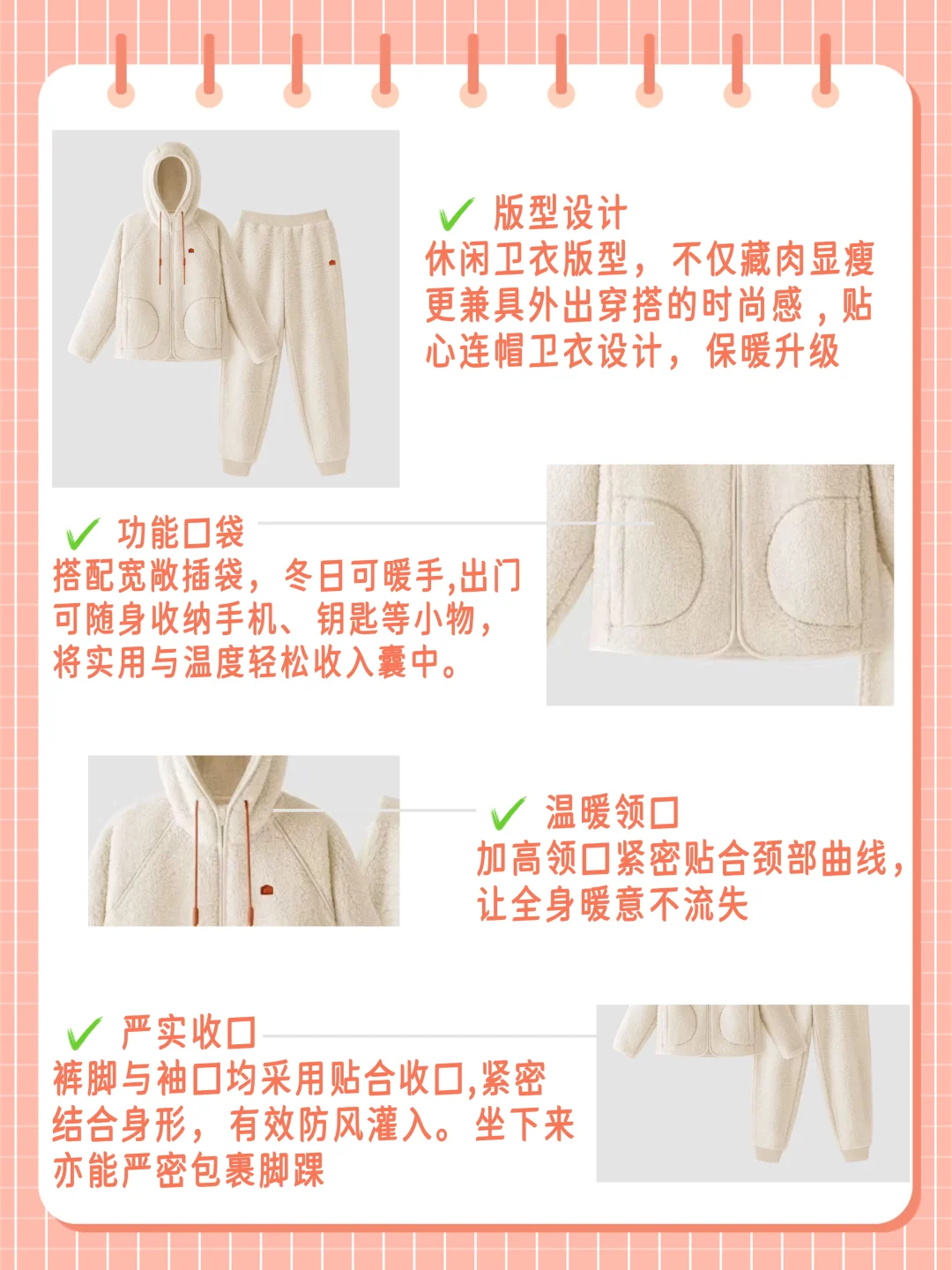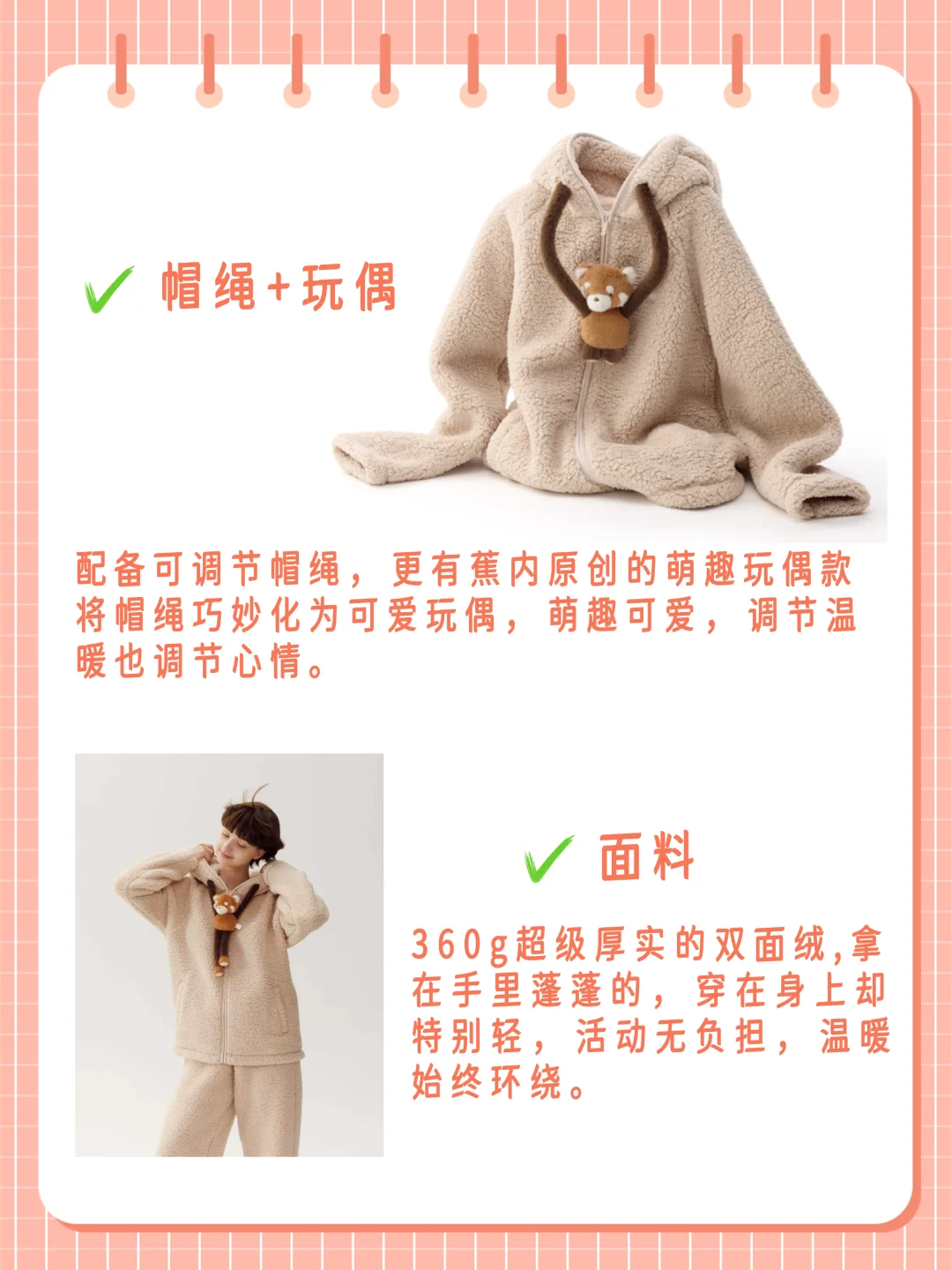 🔺羊羔绒:防风轻便,保暖不厚重,但直接贴肤的柔软度略逊于珊瑚绒