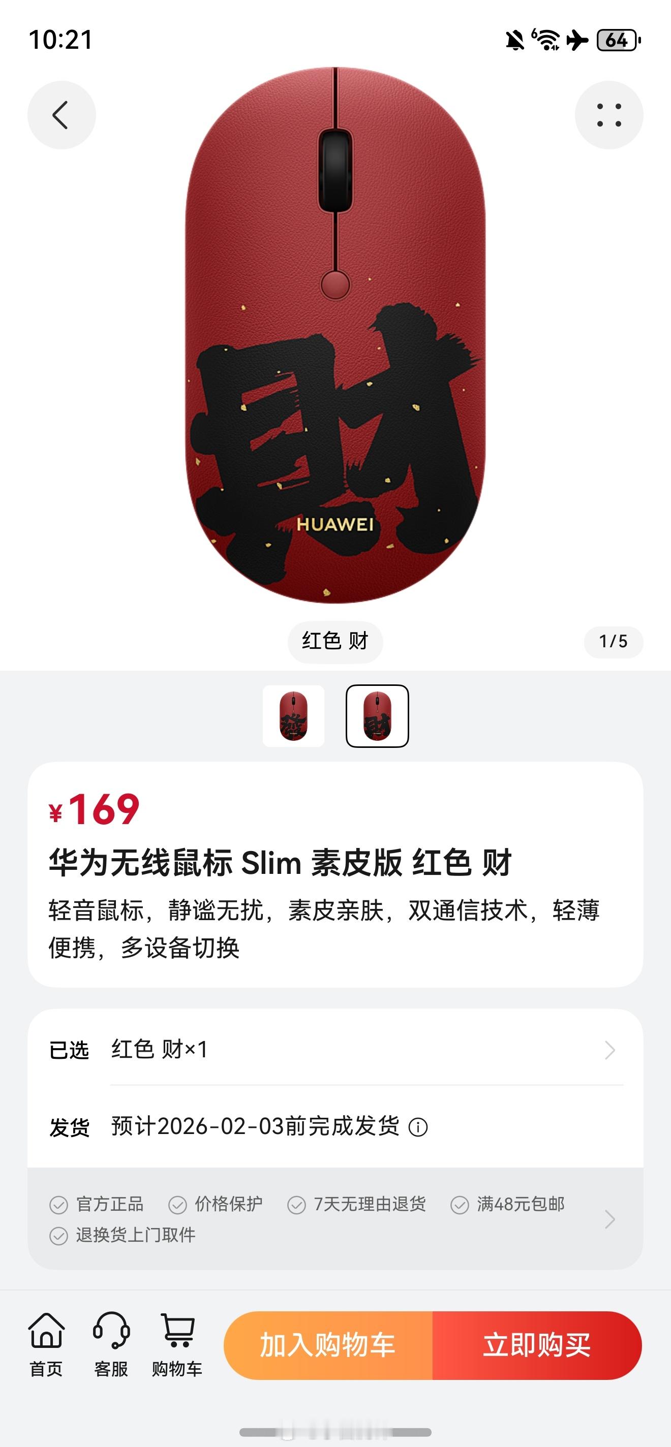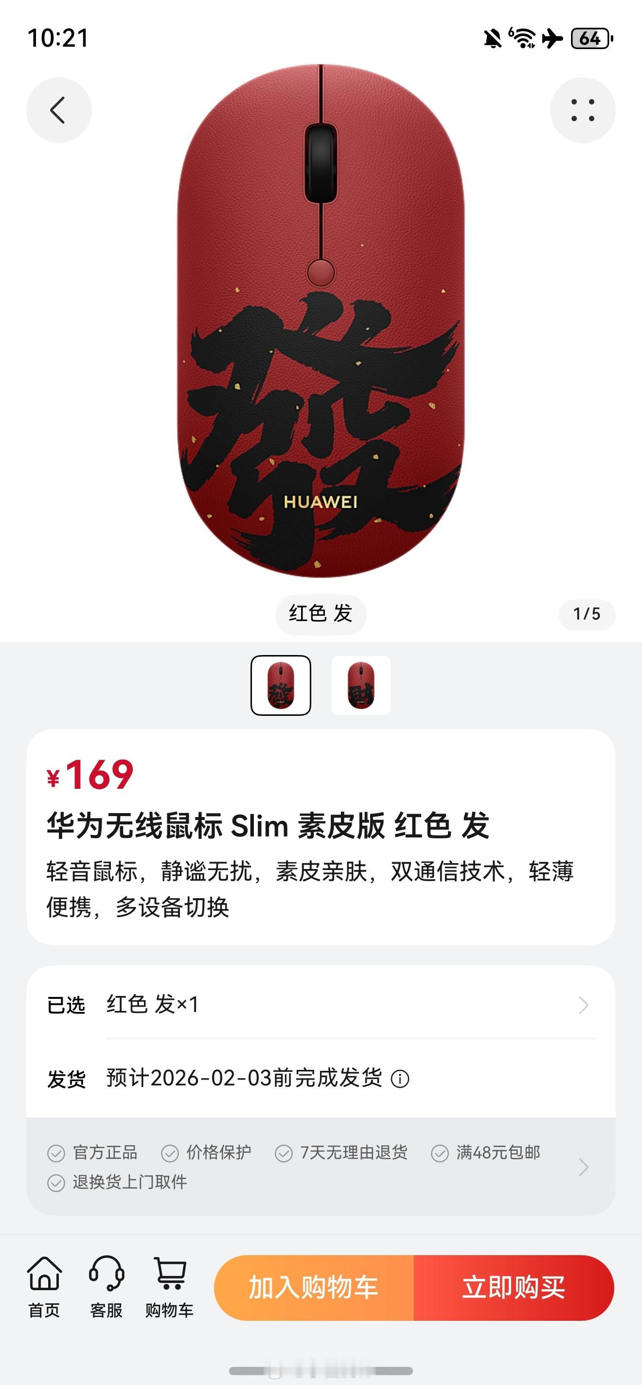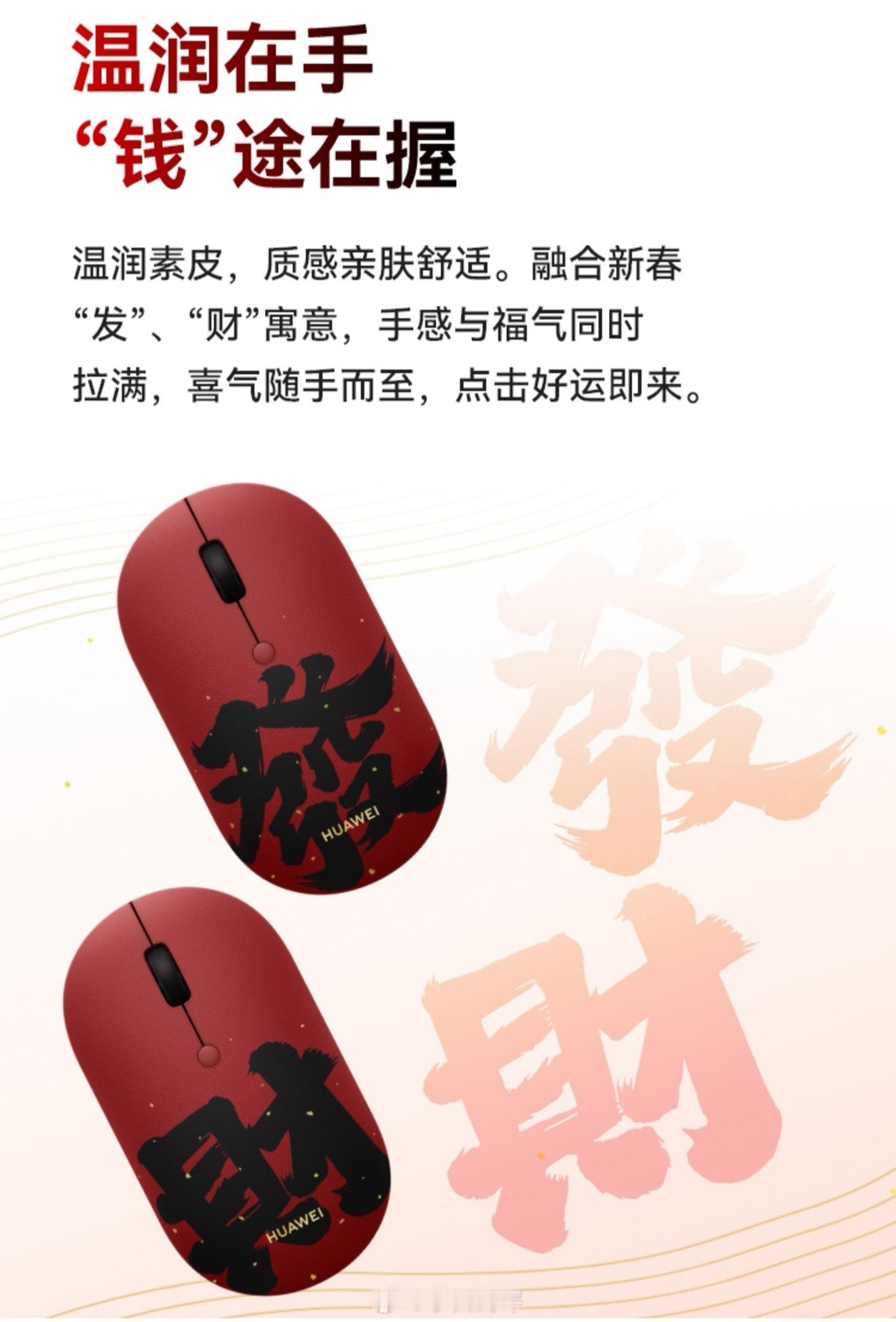 华为上架了个无线鼠标Slim素皮版红色,一个『发』,一个『财』,169元。如果有同时用俩鼠标的人还能凑一对发财大家觉得这鼠标怎么样?