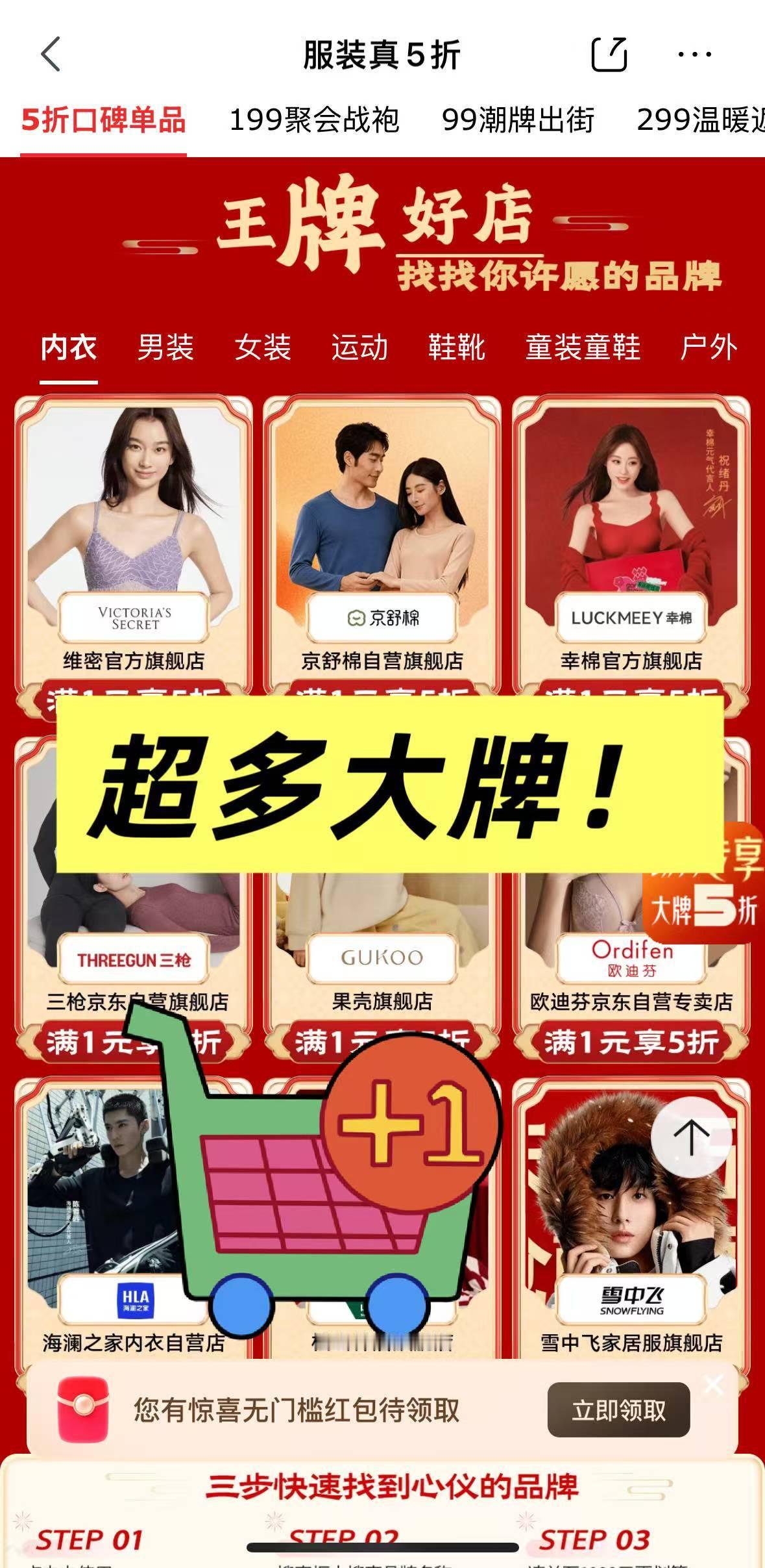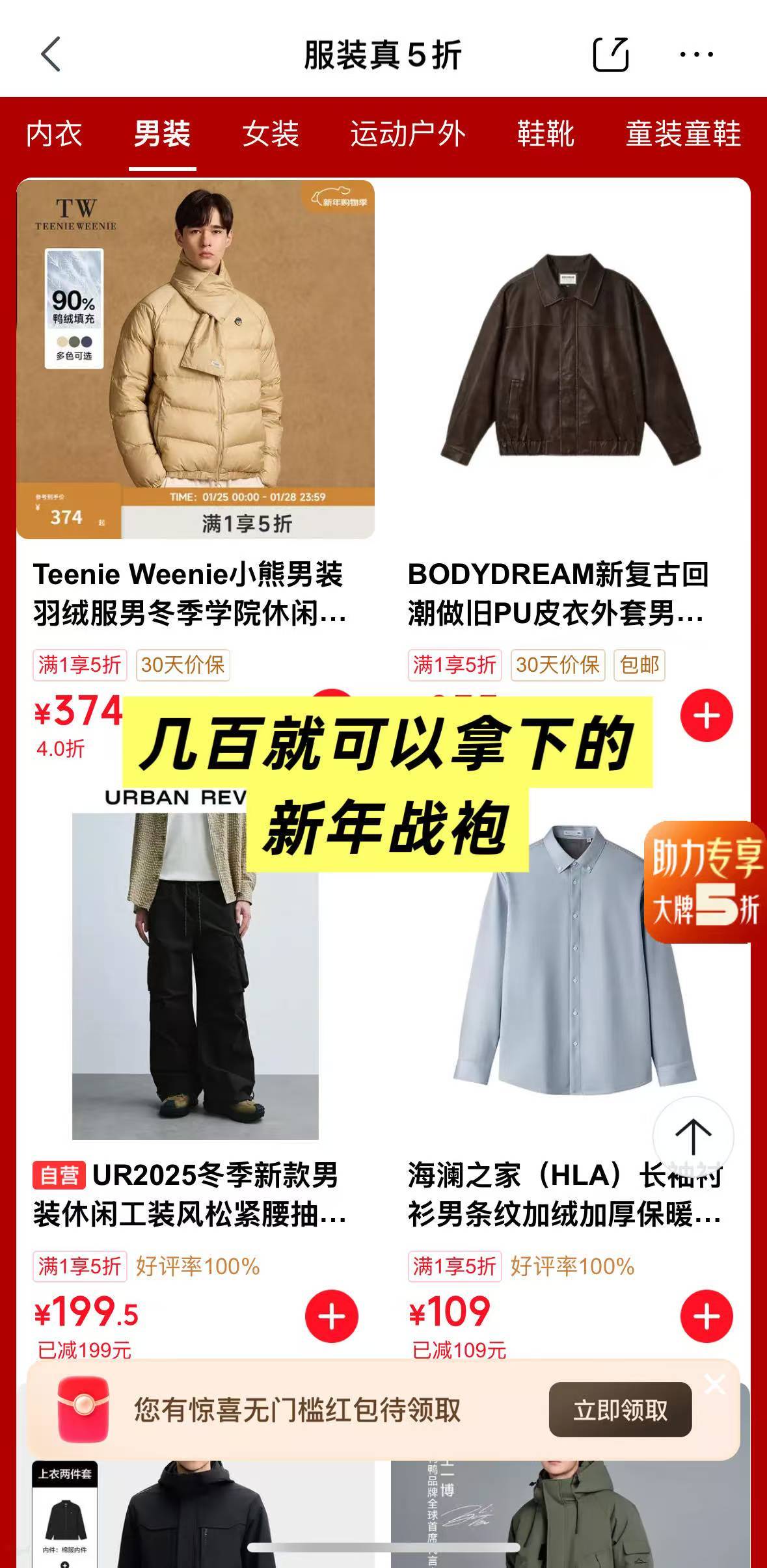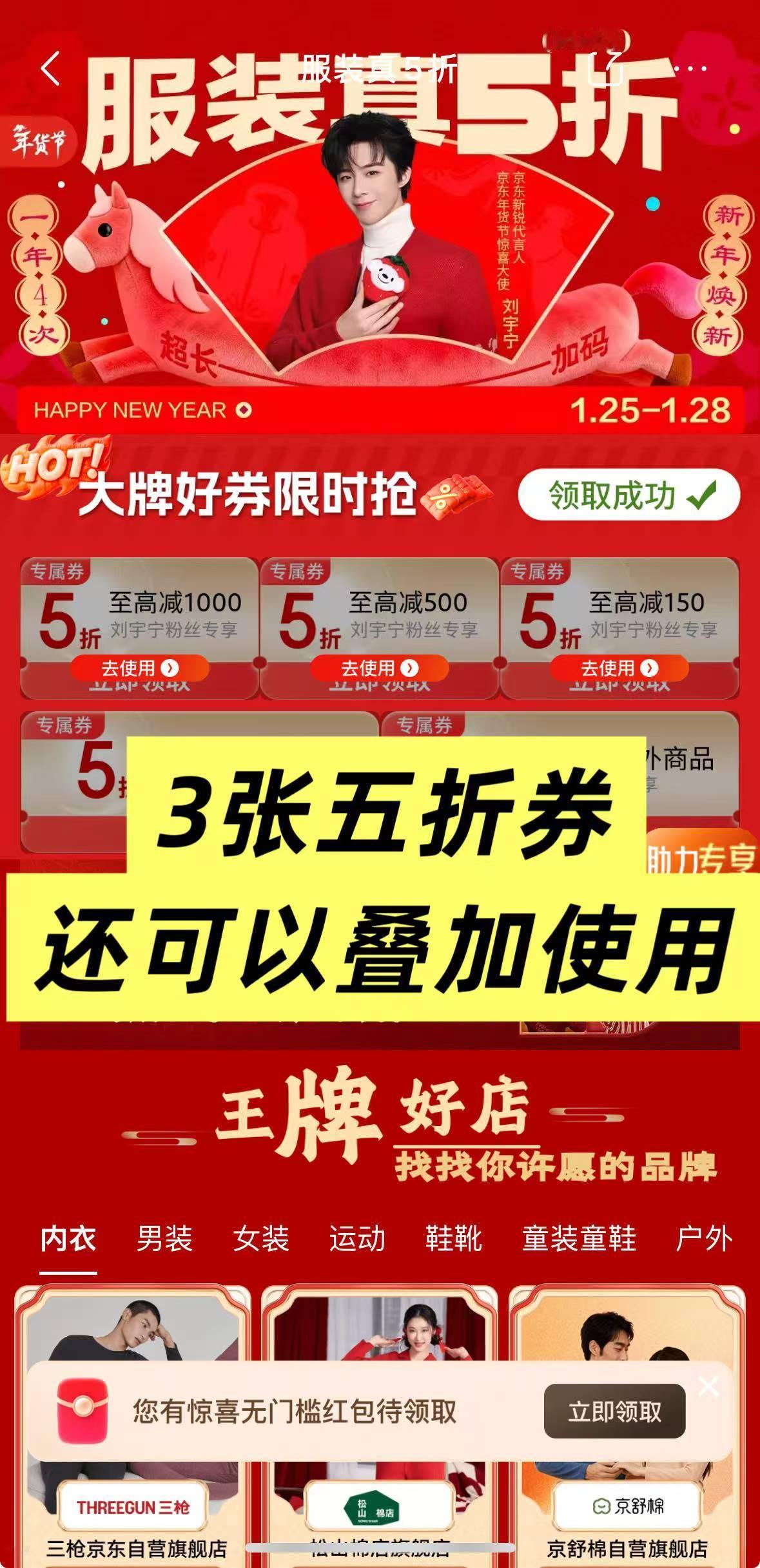 刘宇宁帮你实现新年新衣自由 听说刘宇宁在线给粉丝送新年新衣5折券,本着“不领白不领”的心态打开京东搜索“刘宇宁专属5折”或“服装真5折”,懒得搜的也可以戳【网页链接】直达,没想到真的是5折,满1元立享5折!3张5折券,叠加可以减1650元!京东服装真5折一年4次 波司登、UR、全棉时代、耐克、阿迪、有棵树、巴拉巴拉、海澜之家、北面...1000多个服饰大品牌全部都参与了5折活动,包括新年的新衣服,红衣服、冬季应季羽绒服、毛衣、鞋子、运动服、家居服全部都5折!这谁还吐槽衣服贵呀?我直接疯狂薅羊毛,关键是品牌全品类多,一年才4次这种5折活动,不买真的亏大了!!