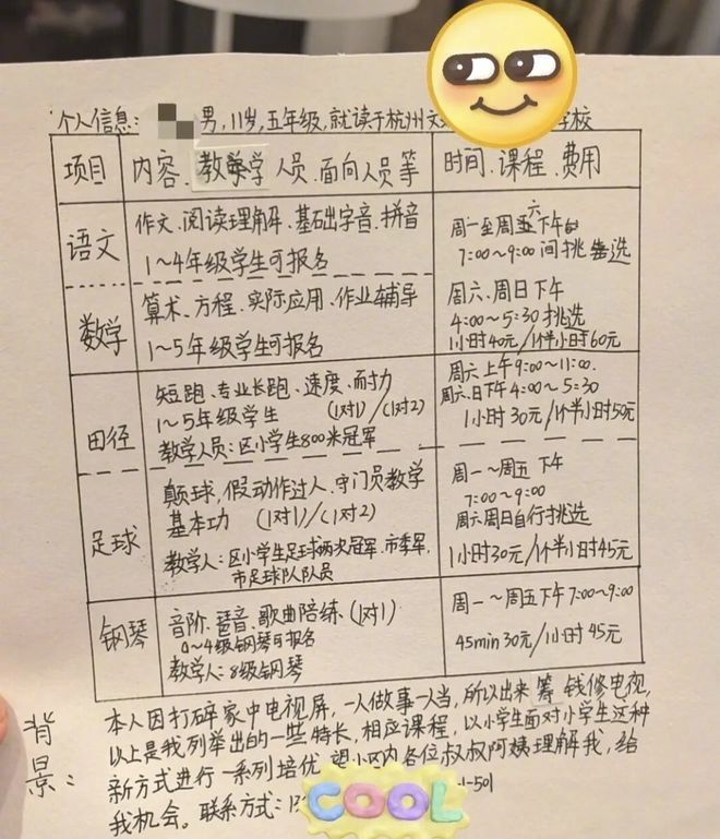 11岁男孩创业还债2个月还清6000元【11岁男孩打碎电视屏,在小区创业“还债”,2个月后……】据央视新闻报道:“数学:算术、方程、实际应用、作业辅导,1-5年级学生可报名。”“足球:颠球、假动作过人、守门员教学、基本功。”“钢琴:音阶、琶音、歌曲陪练,0-4级钢琴可报名。”不久前,一张手写的“求职广告”在网上走红,上面详细列出了数学、足球、钢琴等五门培训课程的时长、费用、教学形式等信息,而教学人竟是11岁的小学生“尧哥”(化名)。这背后究竟有什么故事?01发布“求职广告”的人是来自浙江杭州的程女士,她讲述,这是儿子尧哥五年级时写的。当时,尧哥不小心打碎了家里的液晶电视屏,面对6000元的换屏费,他决定“创业”赚钱。尧哥自己写了一张“求职广告”,上面开设的语文、数学、田径、足球、钢琴课程都是他擅长的科目和兴趣爱好,还写明了“创业”背景:“本人因打碎家中电视屏,一人做事一人当,所以出来筹钱修电视。以上是我列举出的一些特长、相应课程,以小学生面对小学生这种新方式进行一系列培优。望小区内各位叔叔阿姨理解我,给我机会。”针对不同科目,尧哥设定了对应的价格,比如陪写作业一小时40元、一个半小时60元;田径1小时30元,一个半小时50元;足球1小时30元,一个半小时45元;钢琴45分钟30元,一小时45元。跟市场价格比起来,很有竞争力。程女士把儿子的“求职广告”发到小区业主群里,得到了家长们的热烈支持,第二天就开始接单了。“我的聊天栏直接‘爆炸’了,我成了他的经纪人,帮他接单排课。”每天放学后,尧哥上门辅导其他孩子写作业,或在小区草坪上开展足球教学,周末排得也满满当当。辅导结束后,家长会把钱转给程女士,她定期把钱换成现金交给尧哥。2个月左右,尧哥就还清债务,把6000元交到妈妈手上。02为什么当时没有安慰孩子,让他不用担心这6000元钱?程女士表示,“孩子提出要用自身技能弥补错误,这是一次很好的成长实践机会。”在“求职广告”中,尧哥学会了梳理自己的特长:文化课成绩名列前茅、学习钢琴多年,运动方面也是好手。针对不同科目,尧哥还尝试了给课程定价,虽然缺乏科学研判,但程女士没有过多干涉。干着干着,尧哥又萌生了一个更大胆的想法:“报足球的小朋友很多,足球又是团队活动,不如搞一个足球俱乐部,这样比陪写作业更赚钱!”尧哥的想法,获得了妈妈的赞成。她陪尧哥在附近的山坡顶上找到一个废弃的足球场,还购买了足球和标志桶等运动设备。足球俱乐部开业当天,现场来了20多个孩子,尧哥根据年龄和基础水平进行了分组,带着大家一起锻炼,把自己多年来学到的基本功倾囊相授。热身、基本功训练、游戏、实战……15元一节的足球课,从原计划的45分钟实际延长到了一个半小时。在一旁围观的家长们称赞:“这个教练温柔又专业,完全超出预期,这节课性价比很高!”还有家长表示:“效果已经不重要了,一方面是支持尧哥,一方面也让孩子锻炼了身体,自己还能清净一个小时,家里少了鸡飞狗跳。”03创业赚钱的那段时间里,尧哥没有喊过累,每天奔波在小区里陪小朋友写作业、运动,他感受到了输出的快乐,收获了满满的成就感。如今,事情已经过去两年,尧哥正在读初一。不久前,程女士把儿子的这段成长经历发到网上,很多网友给尧哥点赞、留言:“逻辑上看,能列出这个表就不简单。责任感上来看,自己勇于独立承担,难能可贵。”“如果我是小区邻居,狠狠心动。价钱合理,教学人员专业且级别够,交通成本低,很吸引人。”“竟然被一个小孩哥震撼到了,向他学习!”最近,附近小区的家长、上过课的老邻居们又约起了尧哥周末的足球课。“尧哥又要忙起来咯!”程女士笑着说。本文来源:央视新闻微信公众号 综合都市快报(记者 张宇璐)