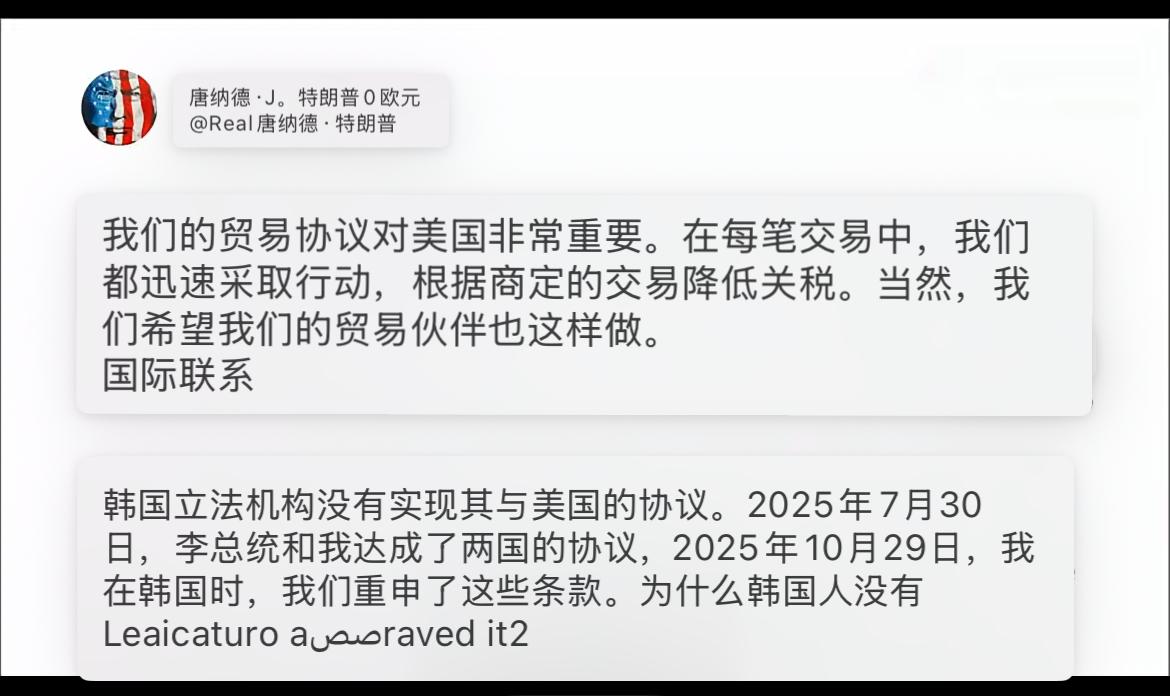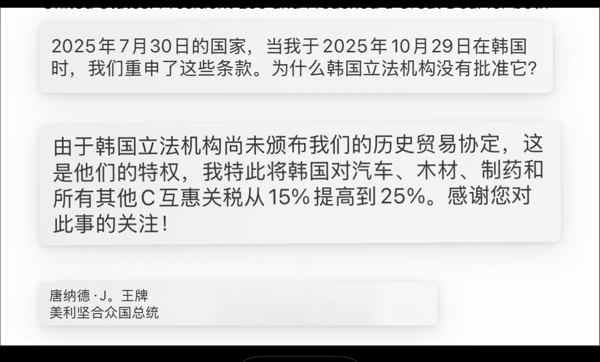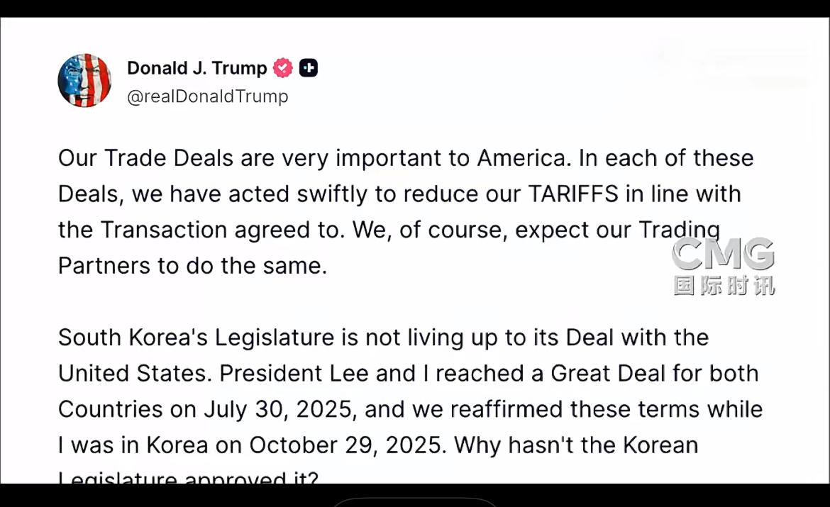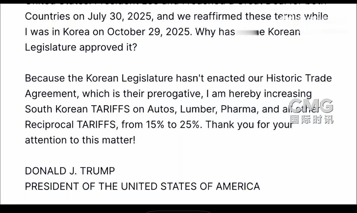 特朗普:将提高对韩关税! 特朗普的加税之举再次上演,这次的目标是盟友韩国。 当地时间1月26日,美国总统特朗普在其社交平台“真实社交”发文称,“鉴于韩国国会未批准并落实此前与美国达成的贸易协议”,美国将提高对韩国商品征收的关税——他已决定把对韩国汽车、木材、制药产品以及其他对等关税项目的税率从15%提高至25%。 看来,特朗普似乎不打算放下关税这把“利刃”,只要对手不顺从,只要自己不如意,就会随时挥动关税大棒,迫使对手就范。韩国也实在倒霉,与美国相距十万八千里,做了美国的盟友,如今不但没得到好处,还可能引火烧身。瞧瞧美国如今那歇斯底里的样子,真是六亲不认、肆意妄为。特朗普提高关税这一决定,无疑会让美韩关系陷入僵局。但也带来了意想不到的好处,我们毫不费力,美国就把围绕我们的一颗颗“钉子”都拔了,在这方面真该给特朗普颁个一顿重的大奖。