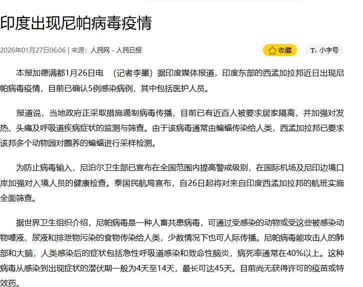 把国门守死,才是对国民最大的负责!看着泰国和尼泊尔紧急加强边境封锁,你就明白事态有多严重了。印度这次捅出的娄子,足以让周边国家倒吸一口凉气。无疫苗、无特效药、人畜共患,这三个标签贴在一起,就是一张“死亡通知单”。在这个节骨眼上,任何形式的“开放”和“宽容”,都是对他国老百姓生命安全的极端不负责任! 印度又出问题了,还是老毛病——病毒没控制住,周边国家一个比一个紧张,这次不是新冠,是个更难搞的尼帕病毒,致死率高、传播方式又复杂,最让人头疼的是,它没疫苗,也没特效药,拖起来就是一场硬仗。 这病毒不光在动物之间传,还能在人和人之间传,最危险的是,它潜伏期长,还没什么症状的时候就能传人,一旦放松警惕,很容易就钻了空子,印度那边已经有医护人员中招,说明问题已经不小了。 可怕的不只是病毒凶,而是它藏得太深,早期看上去就是普通感冒,谁都不会联想到这种病毒,但等到症状出来,往往已经晚了,这时候再查、再管,代价就大了,所以现在防住第一步,比啥都重要。 尼帕病毒不是第一次出现,但每次爆发都让人心惊,这回是在印度东部,过去也不是没出现过,但这次更凶猛,最要命的是,印度的防控体系一向不太靠谱,出了事往往处理不及时,周边国家早就学乖了,宁愿严一点,也不想冒险。 泰国和尼泊尔的反应很快,一看印度出事,立马加强边境管控,不管是机场还是陆路口岸,全都严防死守,这不是怕事,是知道病毒这种东西,一旦进了国门,就不是隔离几个人能解决的事了。 很多人觉得封国门是大题小做,但这类病毒一旦放进来,后果就是一连串的麻烦,从医院到学校,再到社区,传起来根本挡不住,不如一开始就拦在门外,免得后面手忙脚乱。 一些人可能还在幻想,靠体温检测、申报表就能防住病毒,可问题是,这种病毒最难缠的地方就是早期根本看不出问题,你靠这些手段,根本防不住,它不是等你发现才传播,而是一边潜伏一边扩散。 印度的问题不是偶然,是积累出来的,他们过去几年也不是没出过类似的疫情,说明病毒在那片地区早就有根,这次又爆发,只能说该来的还是来了,而我们要做的,就是别让它从邻居家跑到自己家里来。 别指望别人能替你挡住风险。每个国家都得自己守好自己的门,靠别人小心没用,得自己先把事情做扎实,不然出了问题,最先受伤的还是自己人,这个道理已经被现实反复验证了。 国内的情况目前还算安全,但也不能掉以轻心,病毒传不过来是好事,但如果我们自己大意了,就等于是给它留了口子,哪怕只有一个漏洞,病毒也能顺着那条线一路摸进来。 防疫不是喊口号,也不是靠一纸文件能解决的事,真正有效的措施,是靠每一个细节落实,尤其在边境上,该查的查,该隔离的隔离,不能因为怕麻烦就放松警惕,防住第一步,才有后面的平安。 说到底,病毒这事靠的不是侥幸,而是底线思维,你得先把最坏的情况想清楚,才能做出最好的准备,等事情发生了再后悔,那就是放弃了主动权,而在病毒面前,主动权就是命。 有些人觉得封锁太极端,但现实是,病毒不会因为你温和就手下留情,它只看机会,不看态度,你宽松,它就扩散,你严格,它就没路走,这跟做人讲道理完全是两码事。 从印度这次的情况看,医院成了高风险点,这本身就说明问题严重,连医护人员都防不住,普通人更没法保证安全,这时候再谈开放,根本就是拿命去赌,而我们不能也不该赌这种风险。 有些人可能担心经济受影响,但命都保不住了,谈经济也没意义,防疫和经济不是对立的,谁都知道不能一直封着,但关键是,在这种高风险面前,先保命才有后话。 要是病毒进来了,一切都得从头来过,检测、追踪、隔离、治疗,每一步都耗费巨大资源,不如一开始就把门守牢,省得后面疲于应对,这是经验教训换来的认知,不是拍脑袋决定的。 中国这几年防疫经验不少,但也不能因为过去做得好就掉以轻心,病毒变了,传播方式也在变,防控手段也得跟着升级,不能靠老办法去对付新问题,那样很容易出纰漏。 现在最该做的,是把边境口岸的防控再紧一紧,该筛查的不能漏,该通报的不能慢,机场、车站、港口这些地方,本来就是第一道防线,一旦松了,就可能给病毒开了门。 同时,公众的意识也得跟上,不是说没人感染就可以放松,而是要知道为什么没人感染,那是因为防控做得好,不是病毒不存在,不能因为一时安全就掉以轻心,那样只会给病毒机会。 医院方面也不能忽视,过去有些病毒就是在医院里扩散开的,说明防护不到位,这次印度的例子已经很清楚,医护人员都没能躲过,那普通人更危险,医院防控必须重新加码,不能有盲区。 最该警惕的是那些潜在的隐患,不是看得见的问题最可怕,而是看不见的才致命,病毒不声不响就能传播,而我们必须事先就得有准备,不能等到确诊了再行动,那时候已经太迟。