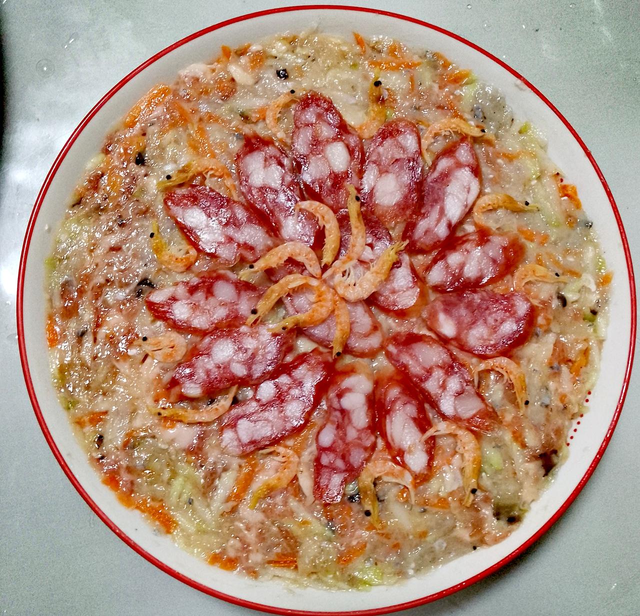 小时候很多广州人都会做年糕,萝卜糕,马蹄糕,芋头糕,这些家庭做的点心只有60后,70后会做了,年轻人不会花时间做的,他们都喜欢拿着手机玩游戏了,我不是喜欢守旧的人,昨天下午我买了一个芥兰头刨丝,腊肠切片,还有🦐干,胡萝卜刨丝,自己创作新的美食,再加上猪肉滑,鲮鱼滑,摆好造型,蒸熟就好了,女儿吃了都说味道还可以!