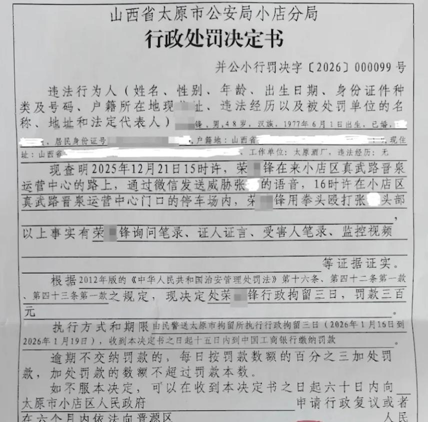 太原酒厂董事长殴打他人被停职,董事长变 “拳王”?80 万货款酿暴力 一笔80万货款,让国企董事长沦为“施暴者”。2026年1月27日,太原市国资委通报,太原酒厂董事长荣某锋因货款纠纷殴打经销商张先生,已被行拘3日、罚款300元并停职检查,一场横跨月余的荒诞闹剧终被追责。 故事始于经销商张先生的讨债之路。他被酒厂拖欠80万货款数月,2025年12月20日上门讨要仍遭推诿。次日,荣某锋先通过微信发送暴戾威胁语音,一小时后便在停车场动了手,拳头直击张先生头部,致其多处软组织损伤,住院半月。 讽刺的是,打人次日,此前拒不结清的80万货款就被迅速兑付。这并非无力偿还,而是荣某锋“拳头优先”的霸权逻辑——用暴力施压,再用货款掩盖恶行。警方的轻罚引发热议,网友质疑“处罚与身份失衡”,直指国企高管法治意识缺失。 国资委虽火速停职追责,但公众更关心纠纷背后的管理乱象。这场闹剧撕开了国企监管漏洞,也拷问着营商环境。唯有彻查深层问题,筑牢法治防线,才能不让老字号蒙尘,杜绝“拳头说话”的荒诞剧重演。
