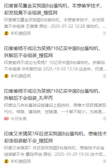 印度偷师不成沦为笑柄?10亿买中国8台盾构机,拆解后不会组装! 麻烦看官老爷们右上角点击一下“关注”,既方便您进行讨论和分享,又能给您带来不一样的参与感,感谢您的支持!   印度近些年一心想搞基建升级,孟买沿海公路隧道、班加罗尔地铁这类重点工程接连上马,可高端工程设备全靠进口。2020 年,印度斥资 10 亿美元从中国购入 8 台高端盾构机,这批设备专门针对印度复杂的地质条件优化设计,本是为了推进本土地下基建项目,却没想到最后成了国际上的笑谈。   印度买这批盾构机,打心底里就没想着只单纯使用。看着中国盾构机在全球市场占据七成以上份额,技术和性价比都远超欧美,印度便想走捷径,打算把设备拆解后研究内部构造,靠逆向工程偷学核心技术,实现本土制造的目标。   为了方便拆解研究,印度还特意要求中方将三台超大直径盾构机拆成上千个零部件运输,甚至直接拒绝了中方工程师入境协助组装的提议,坚称本国技术团队完全有能力独立完成,这份盲目自信,为后续的闹剧埋下了伏笔。   盾构机被称作地下隧道掘进的 “神器”,可不是简单的机械设备,它集机械、液压、电气和智能控制系统于一体,一台设备的零件数以万计,组装精度要控制在毫米级,稍有差错就可能导致整台设备瘫痪,对技术和经验的要求极高。   中国的盾构机技术,也并非一朝一夕得来。上世纪 90 年代,中国修秦岭隧道时还得花大价钱从德国买设备,维修技师一天就要付 3000 美元。从 1999 年开启自主研发,历经二十多年攻关,2008 年造出首台国产盾构机,才逐步形成完整产业链。   如今中国的盾构机产业,从核心零部件制造到设计、施工配套,形成了闭环体系,核心部件自给率超 90%,不仅能满足国内需求,还出口到全球多个国家,在复杂地质的施工表现上,更是远超美日等国的设备。   可印度显然低估了盾构机组装的难度,也高估了本国的技术实力。零部件运到孟买工地后,印度工程师面对堆积如山的零件和厚厚的组装手册彻底傻眼,别说研究技术了,就连基本的组装都无从下手,甚至连液压系统的阀门都能认错,直接烧毁了电路。   更离谱的是,印度团队没有做好精密零部件的防护工作,把造价高昂的传感器、密封圈露天堆放,让这些零件在印度的高温潮湿环境中被侵蚀损坏,进一步加剧了组装的难度。几个月过去,8 台设备愣是没装出一台能用的。   原本计划推进的基建项目彻底停滞,孟买沿海公路隧道工程工期大幅滞后,每天的设备闲置和工期延误都在产生巨额损失。印度工程师折腾了大半年,不仅没摸到核心技术的边,还把不少精密部件弄坏,最后只能硬着头皮向中方求助。   其实印度组装失败,根本不是偶然,而是其工业体系薄弱的必然结果。印度既没有配套的盾构机研发团队,也缺乏经验丰富的操作人员,连基础的螺丝防锈工艺都没掌握,更别说理解盾构机的组装工艺和调试技巧这类 “隐形技术”。   完整的供应链支撑,是盾构机组装和运行的关键,可印度在高端数控机床、精密冶炼、特种钢材等领域都严重依赖进口,本土产业根本无法配套,就算能勉强把设备拼起来,后续的维护和调试也无从谈起。   这起盾构机组装闹剧,不过是印度基建领域诸多问题的一个缩影。长期以来,印度基建发展始终被多重问题困扰,工业体系断层、科研投入严重不足,连基础的制造加工水平都跟不上,高端装备制造更是一片空白。   除了技术和产业的短板,印度的制度问题也拖了基建的后腿。征地流程混乱、部门之间推诿扯皮,再加上资金管理失当,不少基建项目要么开工即停工,要么工期无限拖延。2025 年的国际工程数据显示,印度基建项目的延期率高达 30%。   印度本想靠花钱买设备走技术捷径,却忘了高端技术从来不是靠拆解就能掌握的。中国能在盾构机领域实现从跟跑到领跑,背后是数百亿元的研发投入,上千次的地质模拟实验,还有二十多年的工程实践和经验积累。   这场组装风波,让印度付出了实打实的代价,不仅有设备闲置、工期延误带来的直接经济损失,还在国际上沦为笑柄,被外界诟病 “自不量力”。更重要的是,这一事件彻底打破了印度靠逆向工程快速掌握高端技术的幻想。   最后还是中方工程师远赴印度,仅用几天时间就完成了 8 台盾构机的组装和调试,让停滞的基建项目重新开工。中印团队的效率对比,更直观地体现出两国在工业体系和技术积累上的巨大差距。   这起事件也给所有想走技术捷径的国家提了个醒,基建发展和技术突破从来没有捷径可走。靠金钱堆叠买不来核心技术,靠拆解模仿也学不会完整的产业体系,只有实打实的研发投入、经验积累,完善的产业配套和系统性的制度改革,才能真正撑起基建的发展。   印度也从这场闹剧中吸取了教训,之后不仅继续采购中国盾构机,还在德里成立隧道学院培养专业工程师,尝试搭建本土的技术体系。只是想要真正实现高端装备的自主制造,印度要补的课还有很多,要走的路还很长。