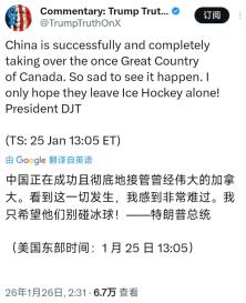 特朗普北京时间1月26日发文写道:“中国正在成功且彻底地接管曾经伟大的加拿大。看到这一切发生,我感到非常难过。我只希望他们别碰冰球!” 加拿大不是美国的私有财产,也不该是任其拿捏的附庸。一个主权国家有权自主选择合作伙伴、制定对外政策。 1月14日至17日,加拿大总理卡尼应邀对中国进行正式访问,此次访问的核心是深化中加两国经贸合作。 双方在访问期间达成广泛共识,签署《中国—加拿大经贸合作路线图》,推出8个领域的28条合作举措,所有合作均基于互利共赢原则,无任何强迫行为,与“接管”无关。 中加此次深化合作,是加拿大基于自身利益作出的自主选择,也是两国优势互补的务实结果。 加拿大在能源、农业领域具备显著优势,中国则在清洁能源、绿色产品等领域发展成熟,双方合作可实现资源互补、共同发展。加拿大可向中国出口农产品、能源产品,中国可向加拿大出口绿色产品并提供技术支持,形成双向互利的合作格局。 据海关总署数据显示,2025年1至11月,中加货物贸易进出口总额达5886.2亿元人民币,其中中国从加拿大进口2738.7亿元,对加拿大出口3147.5亿元。这一贸易规模是双方长期合作积累的成果,也是自愿合作的直接证明。 针对特朗普的造谣,加拿大方面已作出明确回应。负责加美贸易事务的加拿大部长多米尼克·勒布朗表示,中加两国目前未推进自由贸易协定,双方达成的仅是部分重要关税问题的解决方案,均属于正常国家间经贸合作范畴。 加拿大选择深化对华合作,核心是该合作符合其国家利益,是其作为主权国家的合法权利,与“被接管”无任何关联。特朗普一边禁止加拿大与中国合作,一边试图将加拿大捆绑在美国的战略框架内,才是真正不尊重加拿大主权的行为。 特朗普造谣中国“接管”加拿大的行为,凸显其双重标准。美国才是长期操控加拿大的国家,美加关系看似亲密,实则始终处于美国主导、加拿大被动的不平等状态。美国从未将加拿大视为平等盟友,而是将其当作附庸,随意干涉其内部事务。 上世纪60年代,加拿大计划解除对华贸易禁运,向中国出口小麦,时任美国总统肯尼迪直接向加拿大总理施压,甚至以制裁相威胁,强行干涉加拿大对外政策。 近年来,美国频繁对加拿大动用关税手段,无论是木材、铝制品还是农产品,只要不符合美国利益,美国便会随意加征关税。由于加拿大在经贸领域对美国存在结构性依赖,往往只能选择妥协。 数据显示,2023年加拿大货物出口总额的77%流向美国,而美国从加拿大进口的货物仅占其进口总额的14%。这种不对称的依赖关系,导致加拿大在美加关系中始终处于被动地位。 特朗普曾公开扬言兼并加拿大,即便该言论被部分人视为玩笑,也足以体现美国对加拿大的轻视。加拿大安格斯·里德研究所1月14日公布的民调结果显示,90%的加拿大人反对并入美国,可见加拿大民众同样追求国家独立,不愿成为美国的一部分。 中国从未干涉加拿大内政,也未强迫加拿大实施任何不符合其利益的举措,中加合作始终基于平等互利、相互尊重的原则,与美国的霸权行为形成鲜明对比。 特朗普此次造谣中国“接管”加拿大,本质是霸权思维的体现。他无法接受加拿大脱离美国掌控、与中国开展正常合作,便通过虚假言论报复加拿大、抹黑中国。 事实无法被篡改,加拿大作为主权国家的属性不会改变,中加合作互利共赢的本质也不会改变。加拿大有权自主选择合作伙伴、制定对外政策,既不是美国的私有财产,也不是美国可随意拿捏的附庸,这一事实不可动摇。