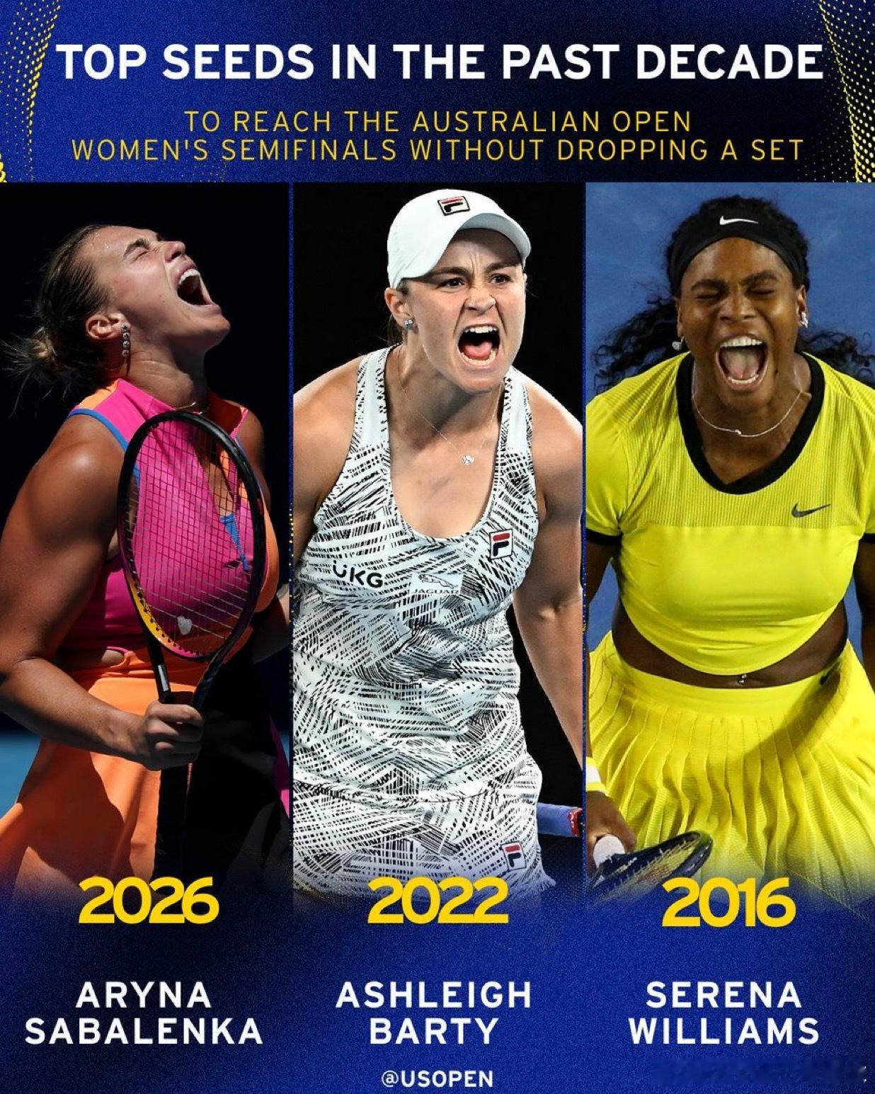 萨巴伦卡追赶前辈脚步👣澳网头号种子一盘未丢打进四强出了今年的萨巴伦卡,只有2016年的小威和2022年巴蒂做到过;不过16年小威最后决赛是负于科贝尔,而巴蒂则在家门口拿下了澳网金杯萨巴伦卡进澳网女单四强wta澳网2026