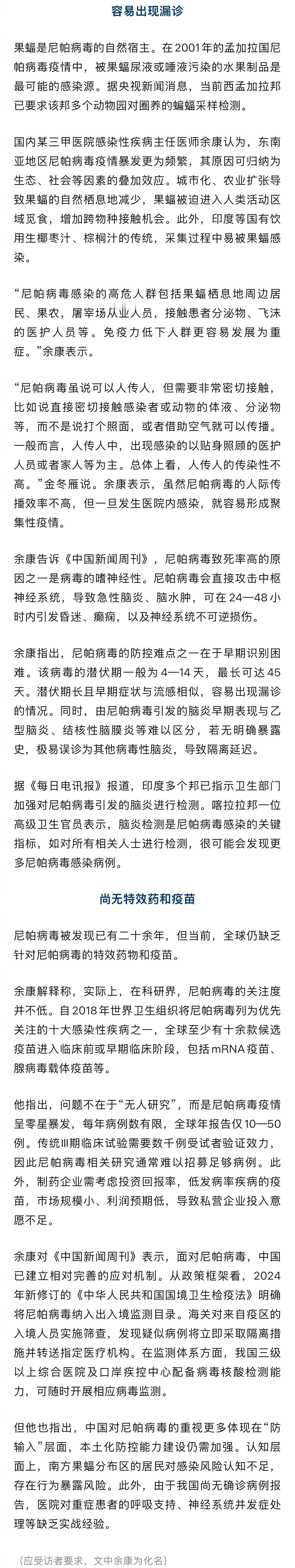 【印度疫情会失控吗?】近期,印度东部的西孟加拉邦出现的尼帕病毒疫情引发全球关注。据央视新闻消息,目前西孟加拉邦已检出5例尼帕病毒确诊病例,感染者正在该邦首府加尔各答及周边医院接受治疗,其中一名患者病情危重。世界卫生组织官网介绍,尼帕病毒是一种人畜共患病毒。该病毒能通过动物或受污染的食物传染人类,也可能直接“人传人”。尼帕病毒的病死率为40%—75%。这一数据会在不同地方的疫情间有所差异,取决于当地的流行病学监测能力和临床管理水平。果蝠是尼帕病毒的自然宿主。国内某三甲医院感染性疾病主任医师余康认为,东南亚地区尼帕病毒疫情暴发更为频繁,其原因可归纳为生态、社会等因素的叠加效应。城市化、农业扩张导致果蝠的自然栖息地减少,果蝠被迫进入人类活动区域觅食,增加跨物种接触机会。此外,印度等国有饮用生椰枣汁、棕榈汁的传统,采集过程中易被果蝠感染。“尼帕病毒虽说可以人传人,但需要非常密切接触,比如说直接密切接触感染者或动物的体液、分泌物等,而不是说打个照面,或者借助空气就可以传播。一般而言,人传人中,出现感染的以贴身照顾的医护人员或者家人等为主。总体上看,人传人的传染性不高。”香港大学生物医学学院教授、香港大学研究学院高级副院长金冬雁说。余康表示,虽然尼帕病毒的人际传播效率不高,但一旦发生医院内感染,就容易形成聚集性疫情。余康告诉,尼帕病毒致死率高的原因之一是病毒的嗜神经性。尼帕病毒会直接攻击中枢神经系统,导致急性脑炎、脑水肿,可在24—48小时内引发昏迷、癫痫,以及神经系统不可逆损伤。余康指出,尼帕病毒的防控难点之一在于早期识别困难。印度感染护士误饮被蝙蝠污染椰枣汁