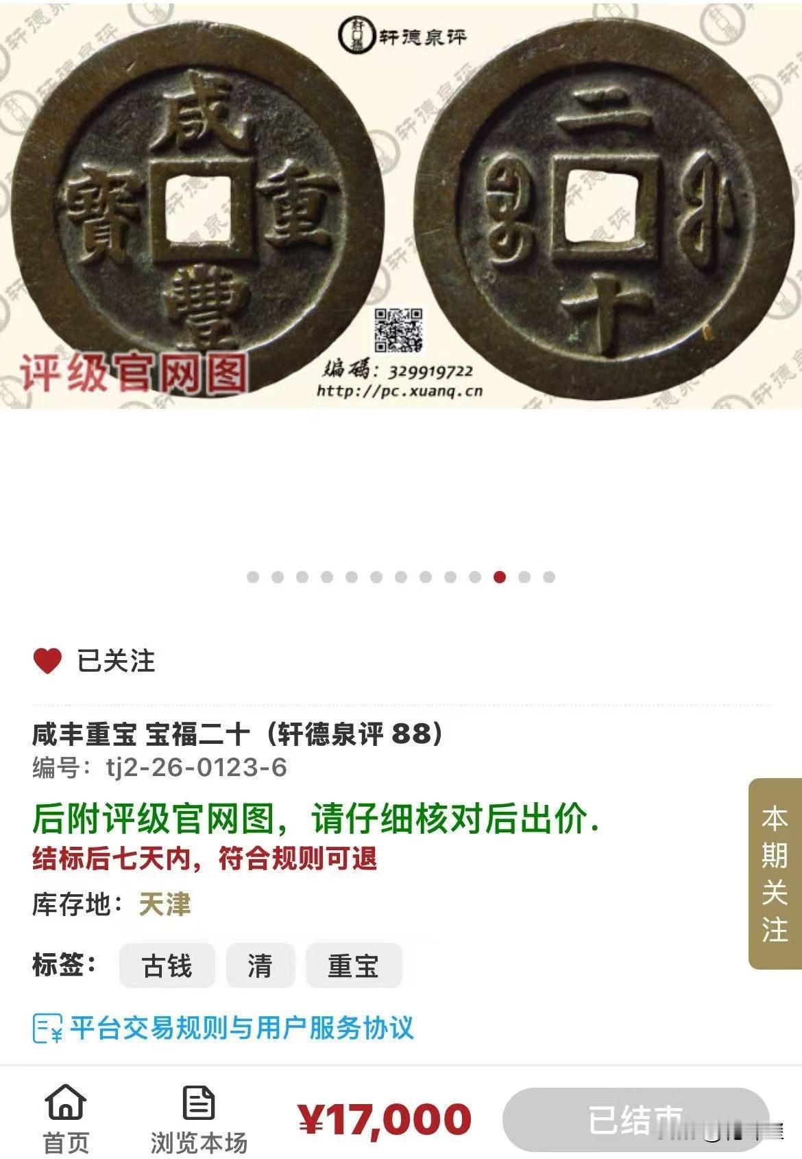 价值17000元的古钱币你家有吗? 2026年1月23日在某夏网拍上截拍的一枚咸丰重宝宝福局计重二十的一枚钱币,评级分数为美88分,经过多次竞拍,以17000元的价格落锤。 因为是“福”局铸造,很受钱币玩家喜爱!所以价格也比其他局价格高不少。 假如你家也有,要好好收藏!咸丰大铜钱 咸丰重宝铜钱 清代钱币 清钱价格 咸丰大钱