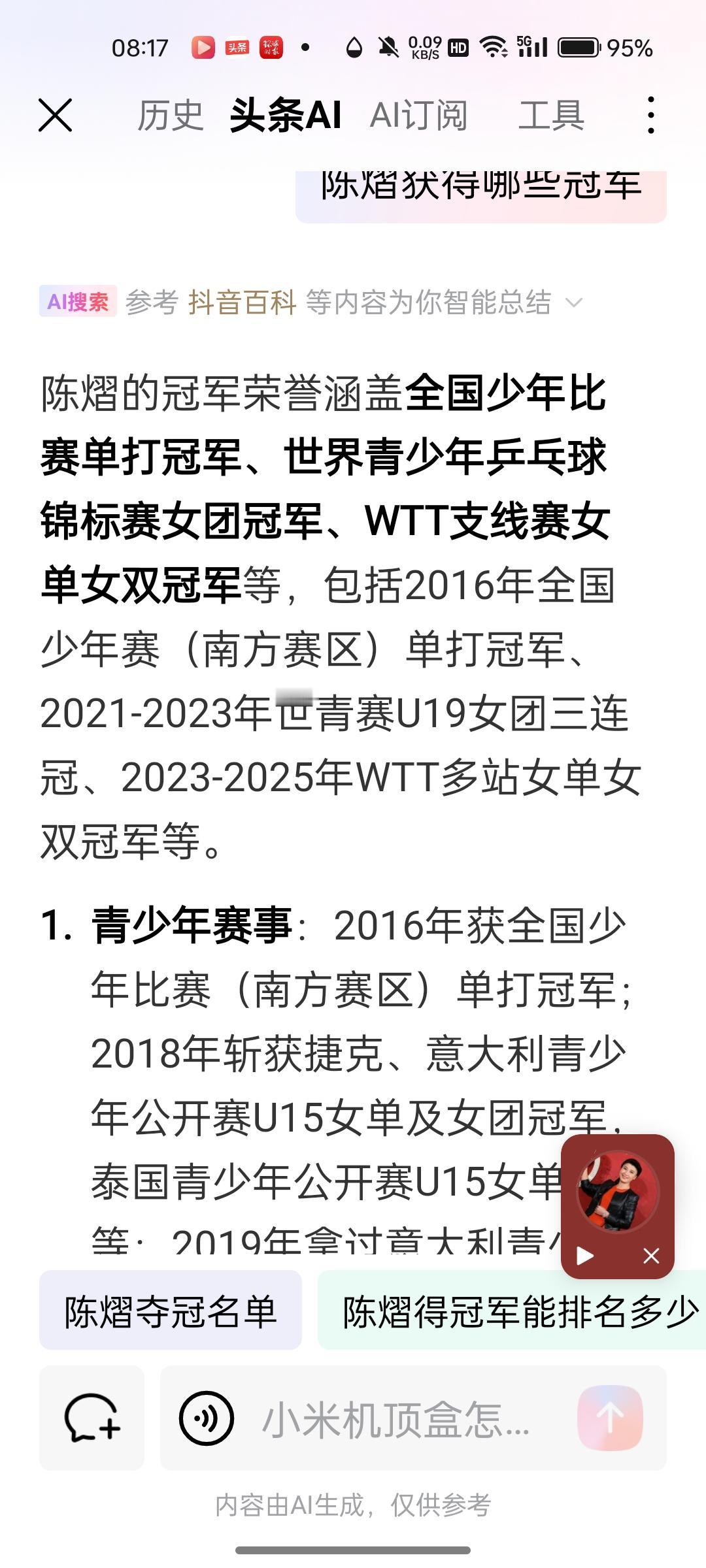 陈熠现排世界第八,温瑞博现排第几呢!好像是第二十四,这也是刚升的,一些大赛他的条件购格么!人家组委会要他么!!!唉,有些黑粉,就是什么都不知,青蛙跳水,不懂装懂,说什么女队培养陈熠,可以参加积分高的大赛,而温瑞博也是培养的重点对象,却只能参加低级别的支线赛,挑战赛什么的,看看陈熠新加坡大满贯赛身兼三项,而温瑞博呢! 那么请问黑粉,请问整天乱叽歪的黑粉们,陈熠打挑战赛,支线赛的时儿,温瑞博在干啥呢,是不是在省体校或者参加青少年赛事呢!! 黑粉们,大度一点,不要鸡肠小肚了,不要揪着陈熠不放了,就是陈熠占不了你们偶像的位置,有的是其她运动员占领你们偶像之位呢,国乒的辉煌是几代运动员努力拚搏,攒下的基业,不是你们偶像创建的,不要防这位,防那位,恐怕其她运动员,阻挡了你们偶像的发光,你们的偶像总有失去光环的那一天的,新的世一正在来的路上!!