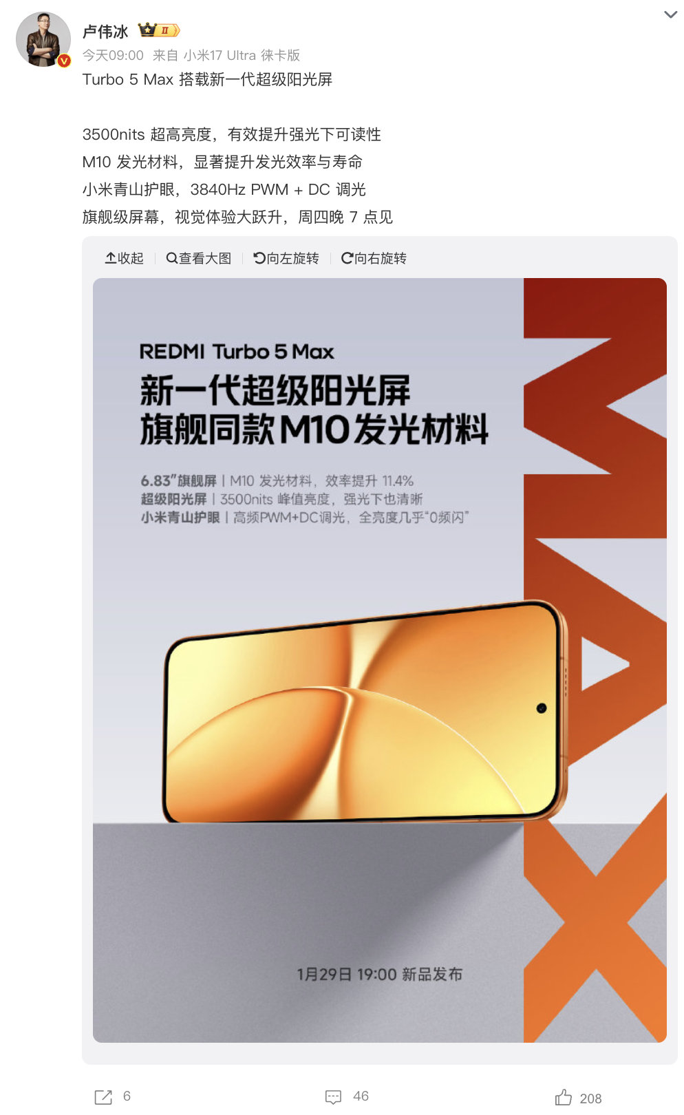 【红米 REDMI Turbo 5 Max 手机搭载超声波指纹,支持滑动录入】红米REDMI Turbo 5 Max 手机进行预热,该机搭载超声波指纹,是 Turbo 系列史上第一次。官方强调,Turbo 5 Max 的超声波指纹相比屏下指纹速度提升 30%,支持滑动录入,录入更高效,无需一次次反复按压,而且识别更准确。回顾官方预热,REDMI Turbo 5 Max 搭载一块 6.83 英寸 M10 发光材料直屏面板提供 3500 尼特峰值亮度,同时还支持小米青山护眼,提供 3840Hz PWM+DC 调光。正面采用窄边框搭配大 R 角设计。其他方面,该机全球首发联发科天玑 9500s 芯片,内置 9000mAh 迄今最大小米金沙江电池,搭载小米澎湃 P3 充电芯片的“旗舰同款”100W 快充,以及最高 27W 反向充电,号称让手机秒变充电宝。此外,该机还实现 REDMI Turbo 系列首次兼容 100W PPS 协议。turbo5max