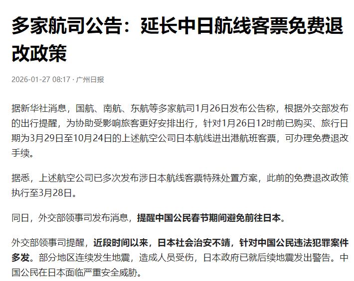 中国三大航空公司突然宣布, 1月26日下午,中国国航、东航、南航三大航空公司接连发通知:中日航线免费退改签政策从3月28日直接延长到10月24日! 最近关注中日往来的朋友肯定能感觉到,气氛有点不一样。一边是外交部1月26日刚发布的提醒,让中国公民春节期间尽量别去日本;另一边就是三大航集体出手,把中日航线免费退改政策直接延长到10月24日。 这两件事凑到一起,不少人都在问:这到底是怎么回事? 最早的导火索要追溯到去年11月,日本首相高市早苗在国会答辩时发表涉台挑衅言论,直接触碰到了中方的红线,中日关系瞬间遇冷。 从那之后,民间的出行意愿就开始明显下滑,最直观的表现就是赴日旅游订单的“退订潮”。东日本国际旅行社的社长都直言,去年12月起,中国大陆的修学团、交流团订单全没了,就算客户付了定金,宁愿亏违约金也要取消行程,1月份更是连散客问询都几乎为零。 而就在三大航宣布延长政策的同一天,外交部的提醒更是给这波出行降温添了一把“火”。提醒里说得很明确,近期日本社会治安不靖,针对中国公民的违法犯罪案件变多,再加上部分地区连续地震,还发出了后续地震预警,中国公民去了面临严重安全威胁。 这个提醒一出来,原本还在犹豫要不要赴日的人彻底打消了念头,已经买票的更是急着退改,三大航此时延长政策,无疑是精准接住了大家的需求。 得清楚,这次三大航的免费退改不是“一刀切”,但规则很明确,咱们旅客记好几点就行。 第一,是客票时间,必须是1月26日中午12点前购买或换开的,国航是999开头、东航781开头、南航784开头的客票,包括里程兑换的机票都算。 第二,是旅行日期,限定在3月29日到10月24日之间,涉及日本东京、大阪、名古屋等主要城市进出港,不管是航司实际承运还是代码共享航班都适用。 第三,是申请时间,得在1月26日0点之后、航班起飞前取消行程才行,之前取消的就不在这个政策范围内了。 值得一提的是,不光三大航,厦航、山航、川航等也跟着同步了政策,相当于整个国内航司阵营都放宽了中日航线的退改限制。 可能有人会问,航司这么做不怕亏吗?其实这是没办法的事,根据航班管家的数据,今年1月中国大陆赴日航班的取消率已经飙到了47.2%,比去年12月又涨了7.8个百分点,到1月26日,2月份已有49条中日航线直接全线停飞。 旅客需求跌得这么厉害,飞机就算飞上天也是高空座率,反而更亏。不如主动放宽退改政策,既减少大家的投诉,也给自己留足调整运力的空间,算是个双赢的务实选择。 这波退改潮带来的影响,其实已经传到了日本那边。大阪的酒店最惨,旗下20家会员酒店里,50%到70%的中国游客订单都被取消了,专门接待中国游客的巴士公司都开始让员工无薪休假了。 零售业也没逃过,去年12月上旬,日本大丸松坂屋百货免税销售额跌了9.4%,高岛屋跌了9.8%,三越伊势丹更是直接下滑20%。 有日本经济学家测算过,要是赴日旅游需求一直这么低迷,一年会给日本造成1.79万亿日元损失,还会拖累GDP增速0.29个百分点,这也能看出来中日旅游往来对双方经济的影响有多大。 之前不少人吐槽日本航空的退改“霸王条款”,除了少数高端舱位,大部分机票退改要收500元手续费,没按时登机甚至要扣一半票价。 而国内航司不仅把免费退改时间拉到了10月,还覆盖了里程票,这对经常往来中日的商务人士和留学生来说太重要了。毕竟谁也没法提前大半年预判会不会有安全风险、政策变动,免费退改就相当于给出行上了“保险”,不用再硬着头皮去冒险。 不过大家也别过度解读,这并不意味着中日往来彻底“断联”。毕竟就在几天前,中国还宣布把日本公民赴华30天免签政策延长到2026年底,免签范围还扩大到了46国,核心还是想促进经贸和人文交流。 要知道日本曾是中国入境游第二大客源国,2019年访华人数超270万人次,疫情后虽有回落,但双方的交流基础还在。 而且民航局去年一季度的数据显示,中日航线航班量已经超过2019年水平,当时国际航线周均客运航班量恢复到了2019年的83.9%,春运高峰更是达到91.3%,说明航线本身的复苏潜力还在。 最后给大家提个醒,当下最该做的就是看清政策细节,合理规划出行。已经买了3月下旬到10月中日航线机票的,不用慌,有变动及时联系航司办理免费退改就行;还没买票的,近期最好先观望,毕竟外交部的安全提醒摆在那,没必要冒风险。 另外不同航司细则有差异,比如川航的申请截止时间是1月26日15点,一定要仔细核对航司官方说明,别错过时间。 总而言之,三大航延长免费退改政策,不是对市场的悲观放弃,也不是刻意的政策倾斜,而是跟着近期中日关系动态和安全形势走的理性调整,核心就是保障大家的出行权益。 毕竟民间交流的需求一直都在,而灵活的政策,就是给这份交流留的缓冲空间。