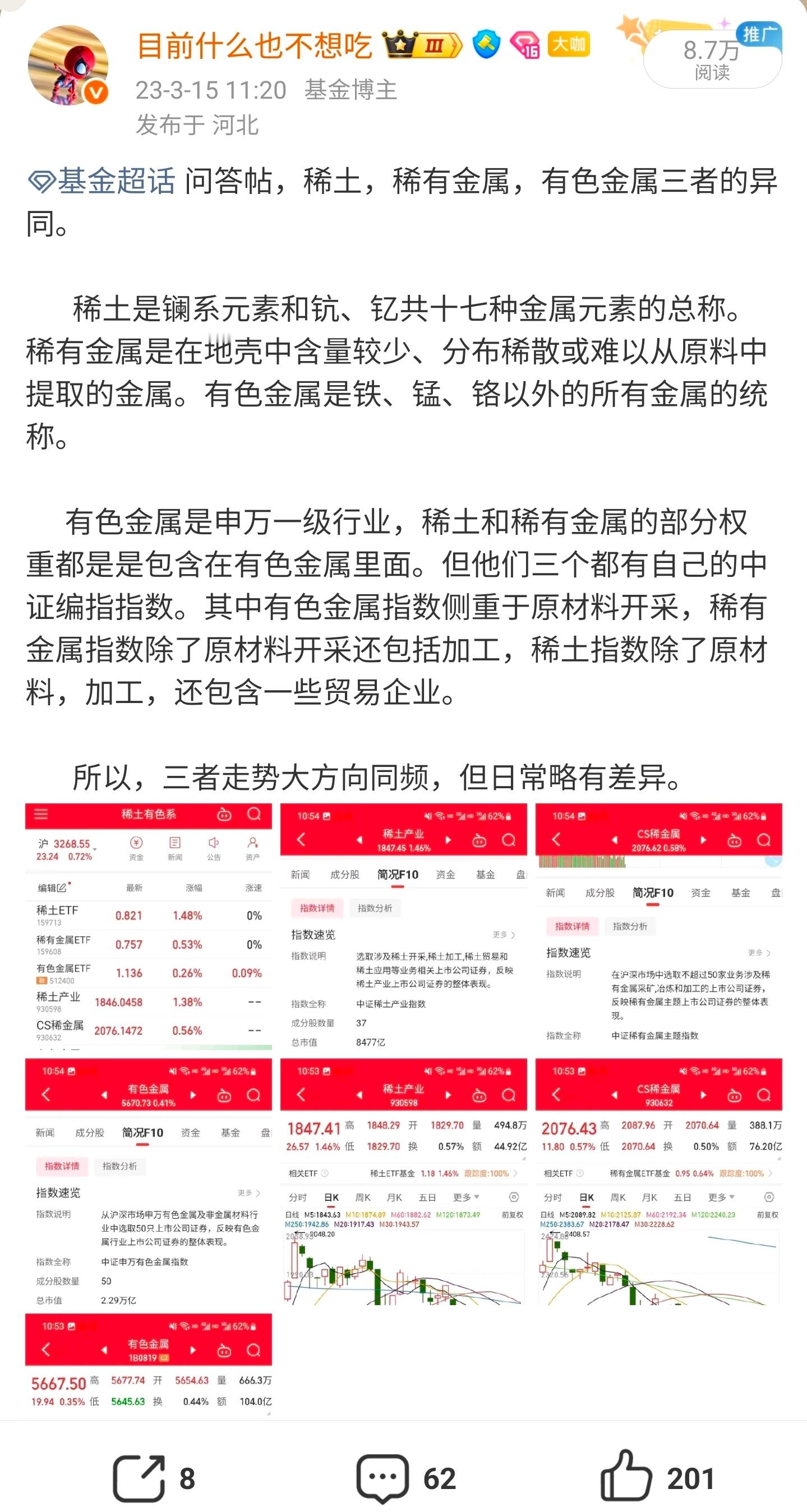 前些年讲过有色金属、稀土、稀有金属等指数的异同,后面又发行了一个“工业有色”指数,这也是最近市场上最热门的指数之一,那么工业有色又和那些指数有什么区别呢?有色金属是一个很大的概念,除了铁锰铬(黑色金属)以外的金属,都算作有色金属。而有色金属又可以继续划分为【贵金属、能源金属、小金属、工业金属】贵金属:这个不必多讲,金银铂就是代表;能源金属:锂矿为代表的,锂钴镍等新能源产业的上游材料;小金属:除工业金属外的、产量和规模都比较小的有色金属;工业金属:铜铝铅锌为代表的工业生产必需品,需求量的产量都很大;这四个里面,工业有色指数是比较纯粹的工业金属,主要聚焦铜、铝、稀土。目前跟踪工业有色指数,场内规模最大的基金是工业有色ETF万家,规模已经150亿了,场内560860 ,场外也有联接基金(A类018489 / C类018490)。