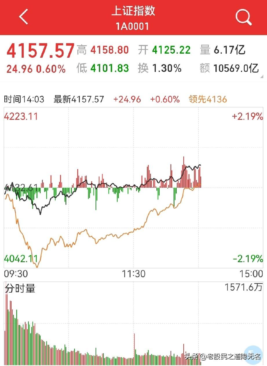 长下影翻盘,后市怎么看? 周一冲高回落,短线向上的希望破灭,周二以为已经向下破位,结果又拉起来… 周二的盘面,早盘老股民也一度以为市场选择短线向下破位,四大题材板块再度向下破位,一幅完全放弃抵抗的味道。 只是,没想到银行(农行的指.导意义很强)、保险居然又出来护盘,.芯片、光伏等又异军突起。 截至老股民写稿之时,商业航天、数字货币、可控核聚变、AI应用四大题材板块完全翻红。 指数上涨,已经超过20个点。 从昨天的“假突破”到今天的“假突破”,老股民的脸是啪啪的拍肿了。[捂脸][捂脸] 接下来,一是看今天,是否还是延续近几天的格局,继续横着走;二是看有色是否退潮(今天算比较明显了,持有的考虑提桶了…)。 老股民前面说过,有色退潮,题材才可能重整旗鼓,这也算顺势而为,既不马上去触“大兄弟”的霉头,也顺势洗盘(只是有点疼人),让热钱去有色站岗。 所以,从今天看,向上变盘越来越临近。