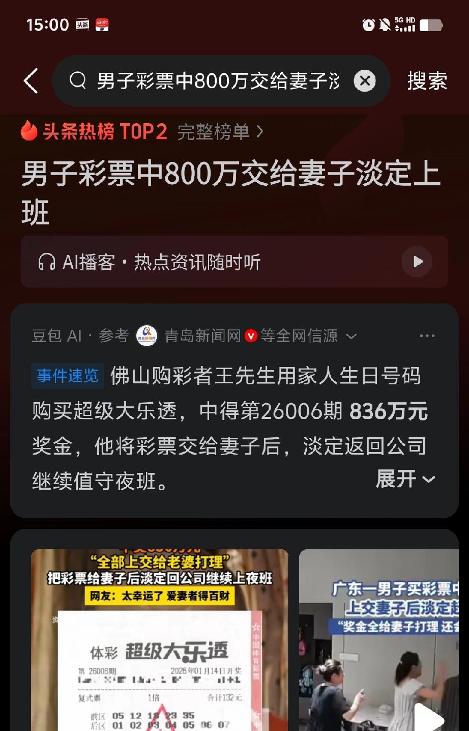 男子中800万大奖上交老婆,淡定上班! 为何这次网友都拒绝相信?[捂脸] 首先,网友拒绝相信的不是有人中奖淡定上班,而是不相信有人中800万。 也是,每次中奖,中奖人都不像国外那样敢露脸拍照。而且我们身边几乎没有发现有现实中的亲友中过奖。 你们生活中的现实亲友真的有中过百万大奖的吗? 我相信别人可能中奖,但我没信心自己会中奖!