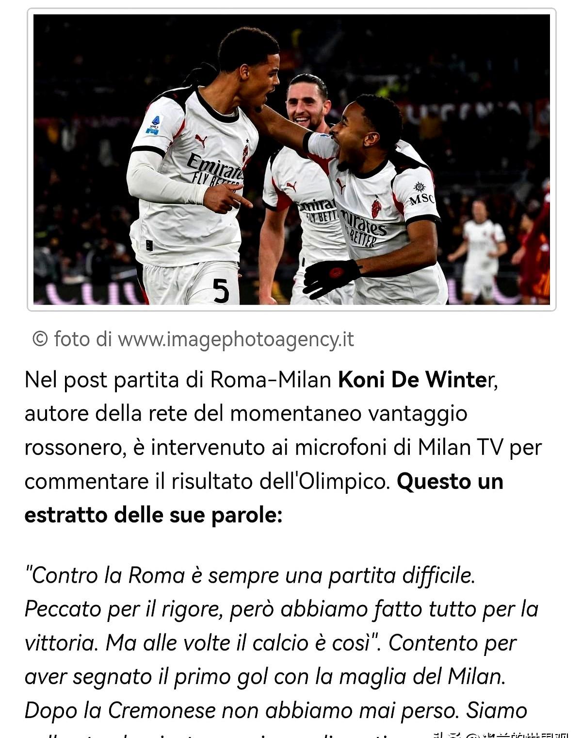 阿莱格里赛后都懵了,明明感觉2:0更近,结果被一个点球扳平! 罗马奥林匹克球场这1分拿得真憋屈。第74分钟,佩莱格里尼那个点球,让米兰到手的3分直接飞了。 多可惜啊!冬窗刚买断的科尼·德温特,下半场才刚用一记头球轰开了大门,打进米兰生涯首球! 老帅也坦白,当时莱奥和恩昆库状态正好,但他想换上普利西奇的拼劲去守住胜利……谁知道呢。 全场最忙的还得是门将迈尼昂,一个人贡献了6次神扑,不然结果更难说。 从克雷莫内塞那场之后,联赛21场不败的纪录还在继续。客场1:1,这1分你觉得是赚了还是亏了?