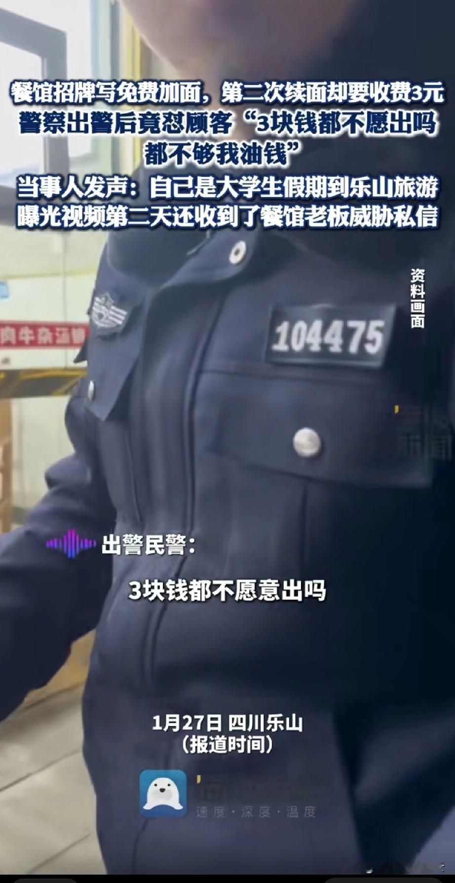大学生去四川乐山旅游,在面馆吃面时,看到牌子上有免费加面的字样。他续了一次面后,第二次要求续面。老板却说再续面就必须加三块钱。 大学生说牌子上明明写着免费加面,为什么第二次续面就要加钱了?他和老板讲道理,老板不听,收走了他的碗,大学生也因此报警。 帽子叔叔来了,一看就是一碗面的事。他有点不耐烦,对大学生说三块钱你都不愿加吗?你现在还吃不吃,吃我给你出这三块钱。随后他抱怨了一句,三块钱都不够我油钱。 大学生觉得帽子叔叔这明摆着是帮本地人说话,偏袒他们本地人。他就把这个视频发到了社交平台上。 大学生说视频曝光后他受到了面馆老板的威胁,他们还骂他。 虽然事看起来不大,但是老板你既然写了就要做到,做生意的最重要的就是诚信经营。如果你觉得亏本了,可以写最大续面一次,但是你写的是免费加面,大多数人的想法就是可以无限续面。 还有帽子叔叔,事可能确实不大,但是你的办案态度,也影响着一个城市的温度,一次好的体验才能留住游客。 对于这件事,你怎么看呢?