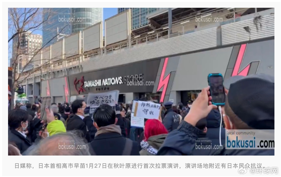 #高市早苗拉票演讲遭日本民众抗议#【“高市下台!”高市早苗选举拉票演讲第一站,遭日本民众抗议】#日本抗议者大喊高市下台# 据日本时事通讯社报道,日本众议院选战正式打响,日本首相高市早苗1月27日在东京秋叶原进行了首次拉票演讲。报道称,演讲场地设置了严密的安检措施。在演讲场地周边,有抗议人群举着“没有意义的解散”等标语对高市早苗提出抗议。此外,根据日本社交媒体上流传的现场视频,抗议人群还举着“遵守无核三原则”、“损害国家利益的首相高市早苗”等标语。有抗议者大喊“高市下台”等。