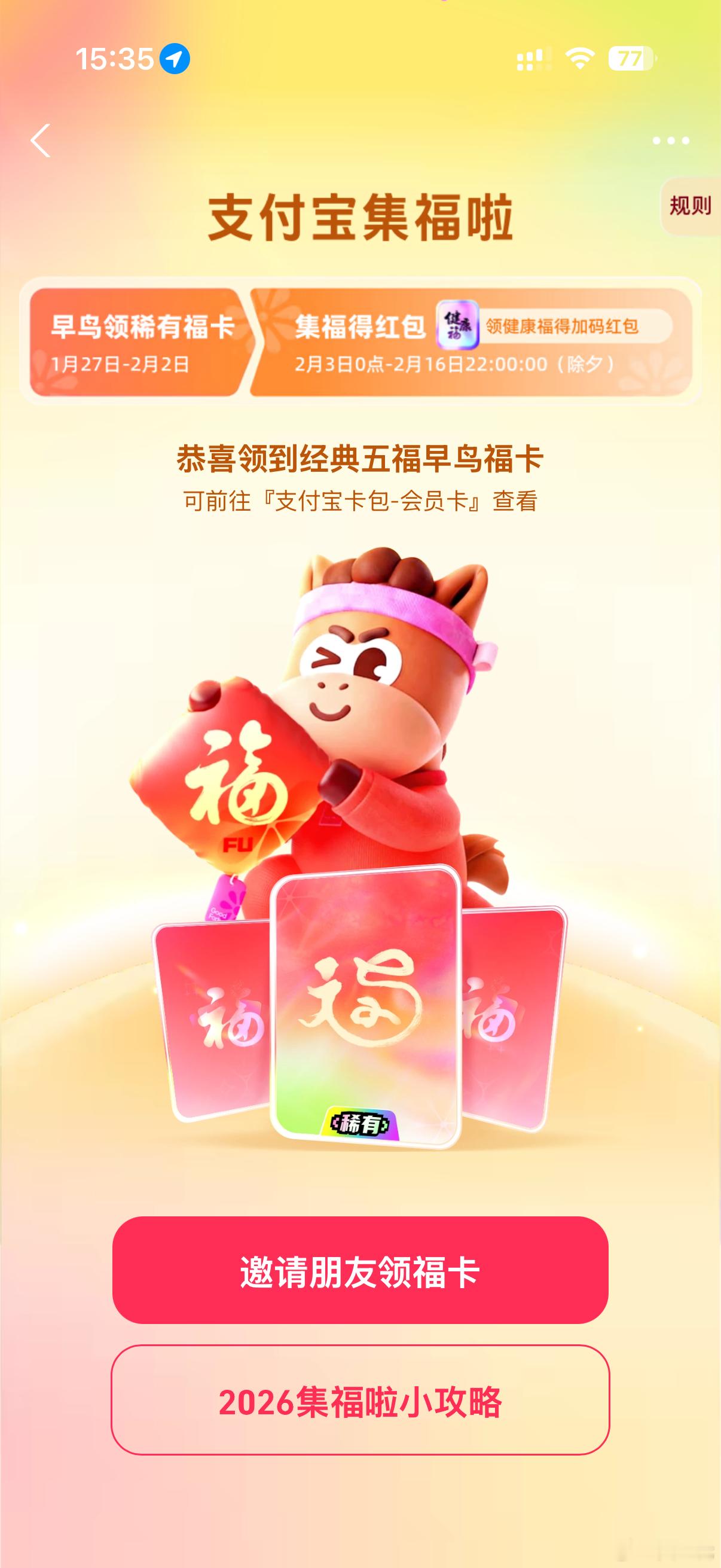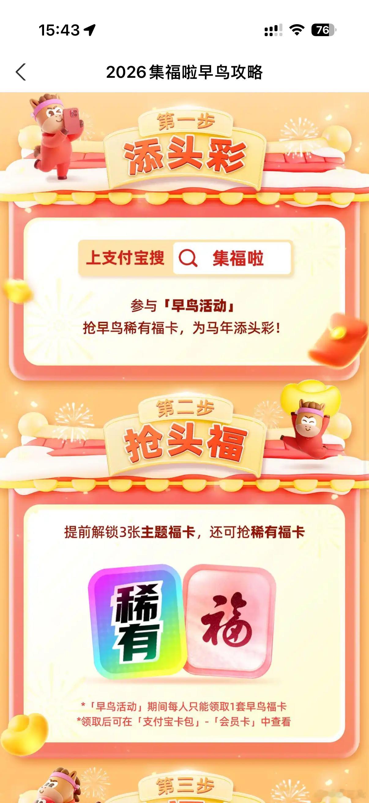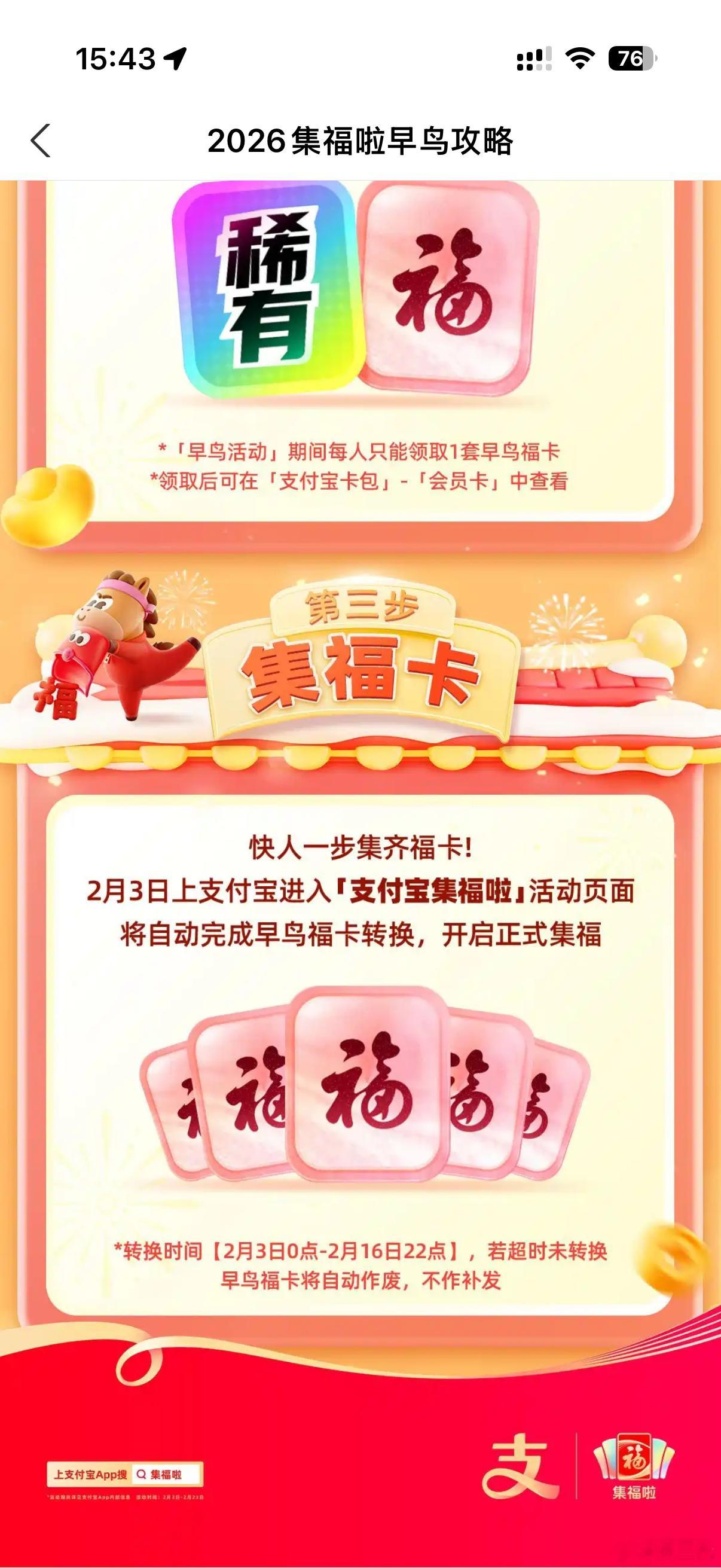 支付宝集福今天就开始了,早鸟活动可以领取3张福卡,但现在还看不到是什么。无奖竞猜:今年我能不能分到超过两块钱?