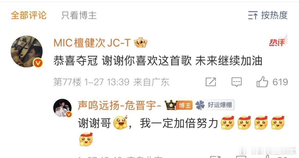 檀健次恭喜危晋宇夺冠声鸣远扬 危晋宇演绎檀健次《Dead Reflex》夺冠,坦言跨年夜被现场打动,檀健次温柔回复谢谢你喜欢,恭喜夺冠未来加油~