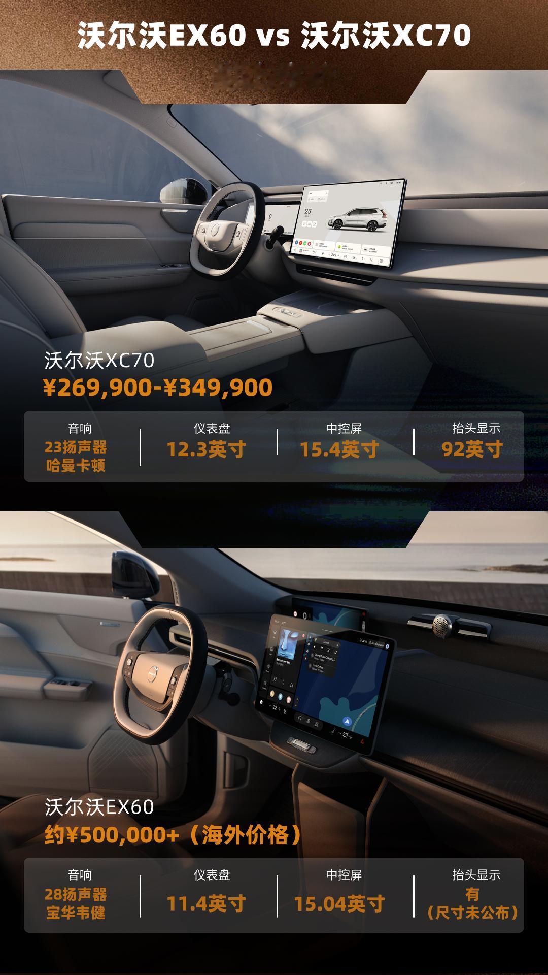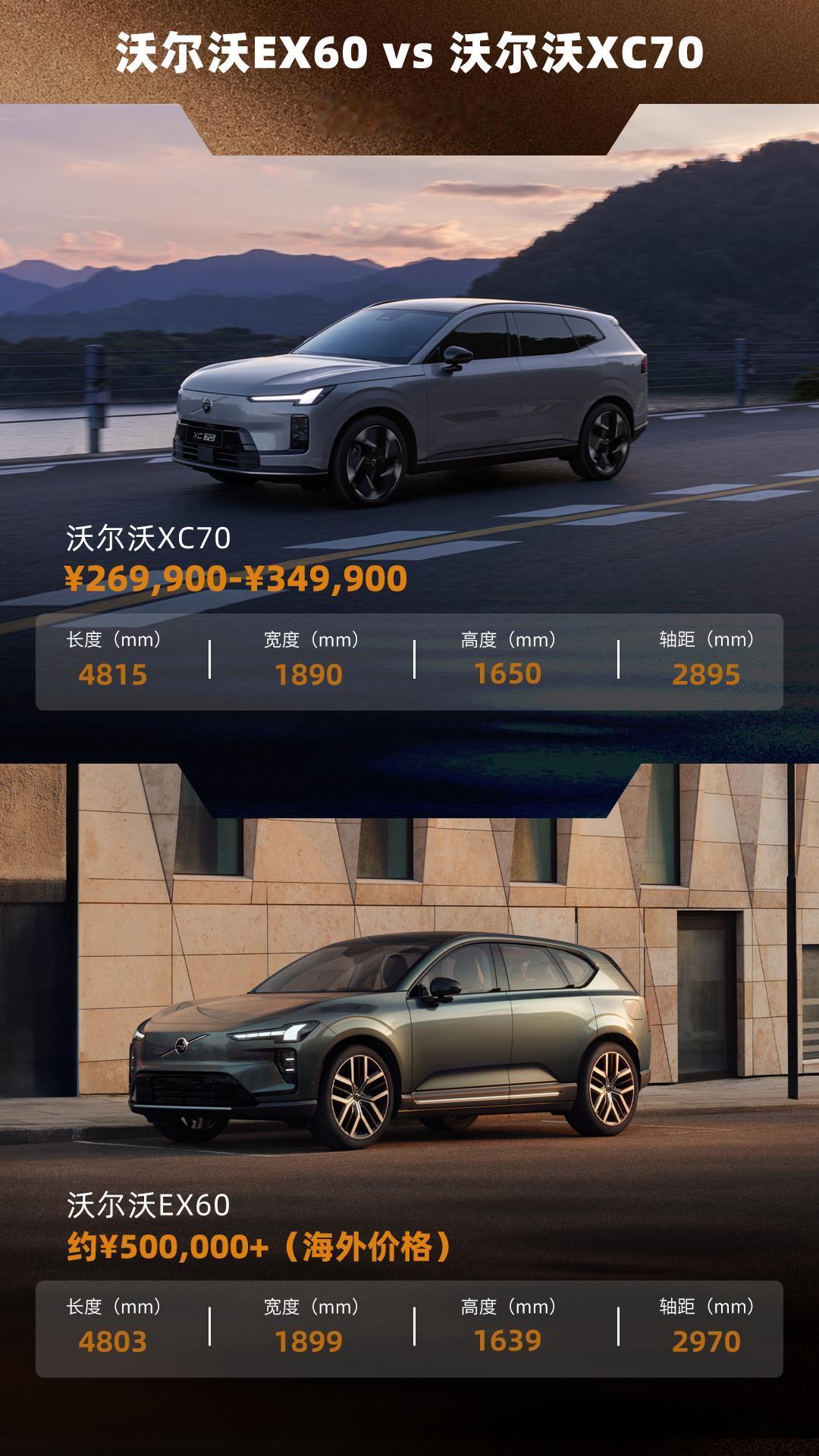 【EX60、XC70 兄弟对比,选国产还是等进口?】 沃尔沃EX60海外发布最近热度挺高,有网友问都有XC70了为啥是还要造一台EX60,是选国产还是等进口,于是来帮大家总结下 ✅定位&设计 两台车的设计和尺寸很接近,几乎就是兄弟车型,EX60主打纯电,XC70主打混动,主要是在国外,几乎都是直接上纯电,BBA和沃尔沃都是一样的思路,但在国内,混动车型往往更受欢迎,所以两台车也算是因地制宜了 ✅平台&性能 EX60:SPA3 纯电平台,纯电续航 620/660/810km,零百 3.9/4.6/5.9 秒,后驱 / 四驱可选,从平台来看EX60会更加主打操控和性能 XC70:SMA 超级混动,纯电超200km,综合续航超1200km,零百 8.0/5.28 秒,前驱 / 四驱可选,整体会偏家用,好上手,适合大部分人 ✅内饰&智能 两台车车内都很沃尔沃,采用了简约、家居风格和极高的安全环保标准,具体配置区别在图3,虽然XC70用了哈曼卡顿音箱,EX60用的还是宝华韦健,但视听效果都很不错,并且在智能化上,XC70明显更能跟上国内的使用需求 ✅价格预测 EX60:海外约 50 万 +,即便进入国内预测价格也不便宜,而且时间未知 XC70:26.99 万 - 34.99 万,国产现车直接提,30 万内拿下豪华超混第一车 所以,虽然沃尔沃EX60的键盘值很高,但现阶段还是入手沃尔沃XC70更合适!