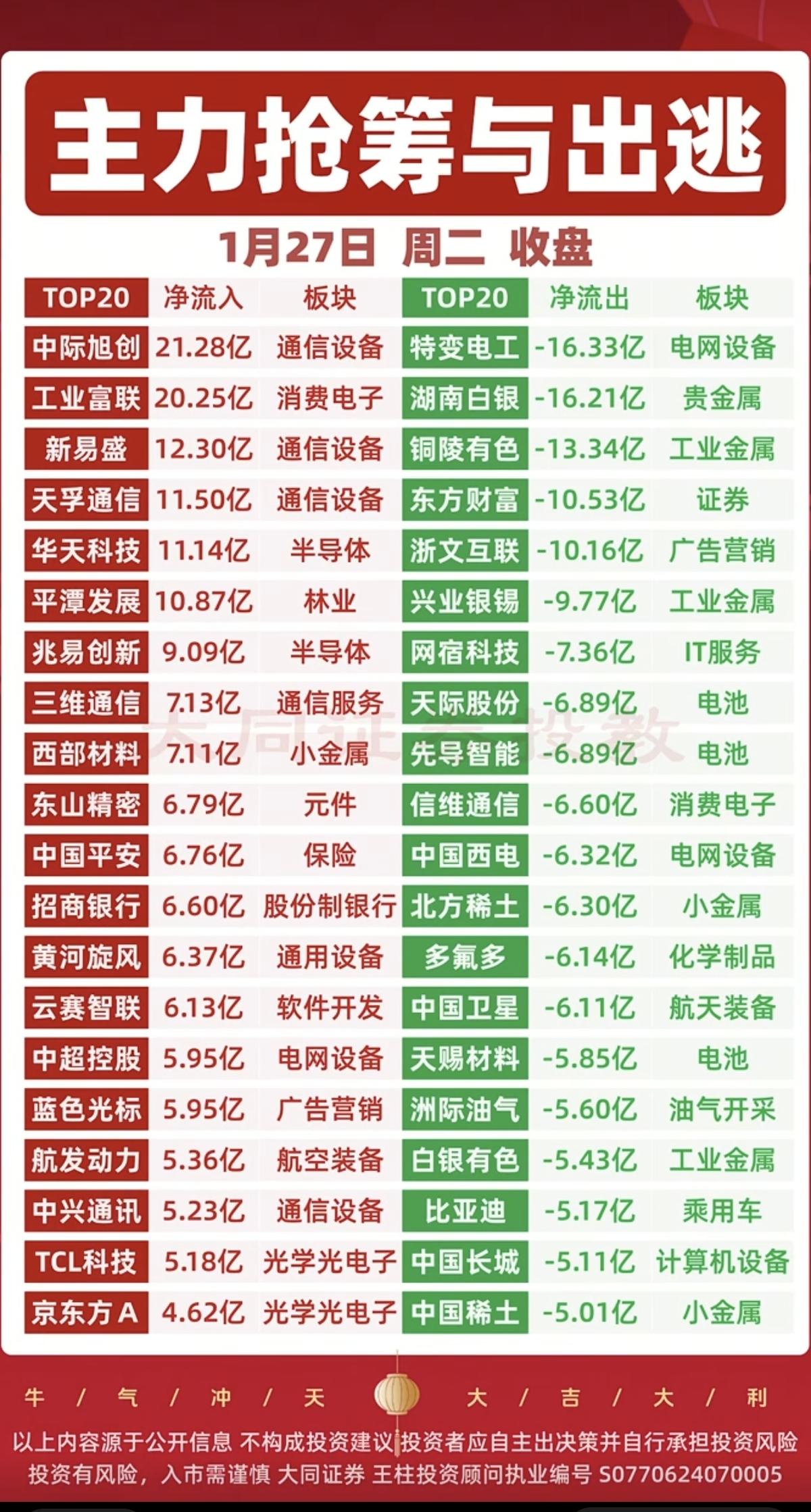 1.27周二 主力资金 抢筹出逃个股榜 ! 资金 抢筹热点: 1.珠宝首饰贵金属 2.存储芯片 3.通信服务 4.光通信模块,快手概念 5.软件开发,航空装备 资金出逃:电池相关,电网设备,油气