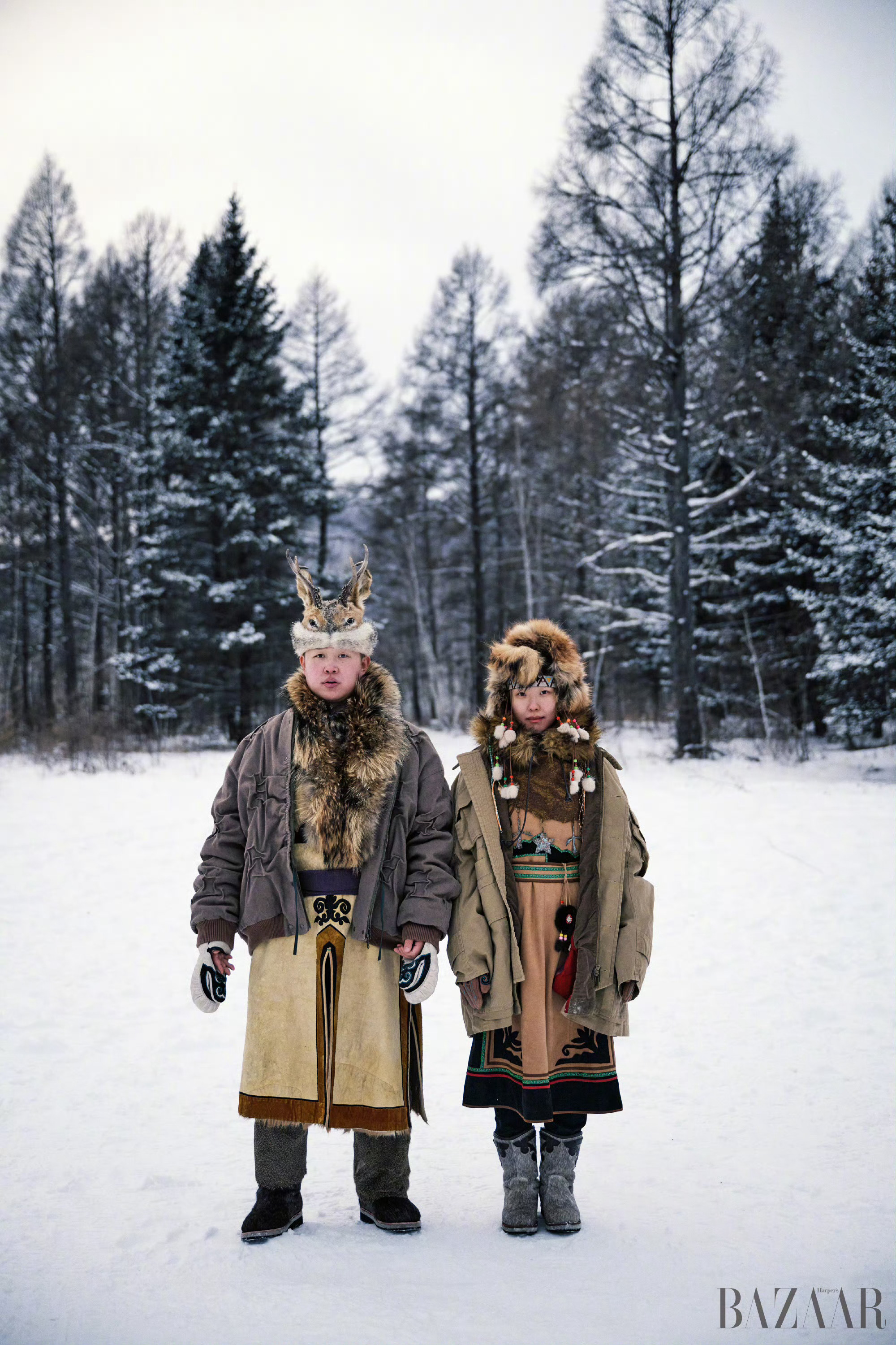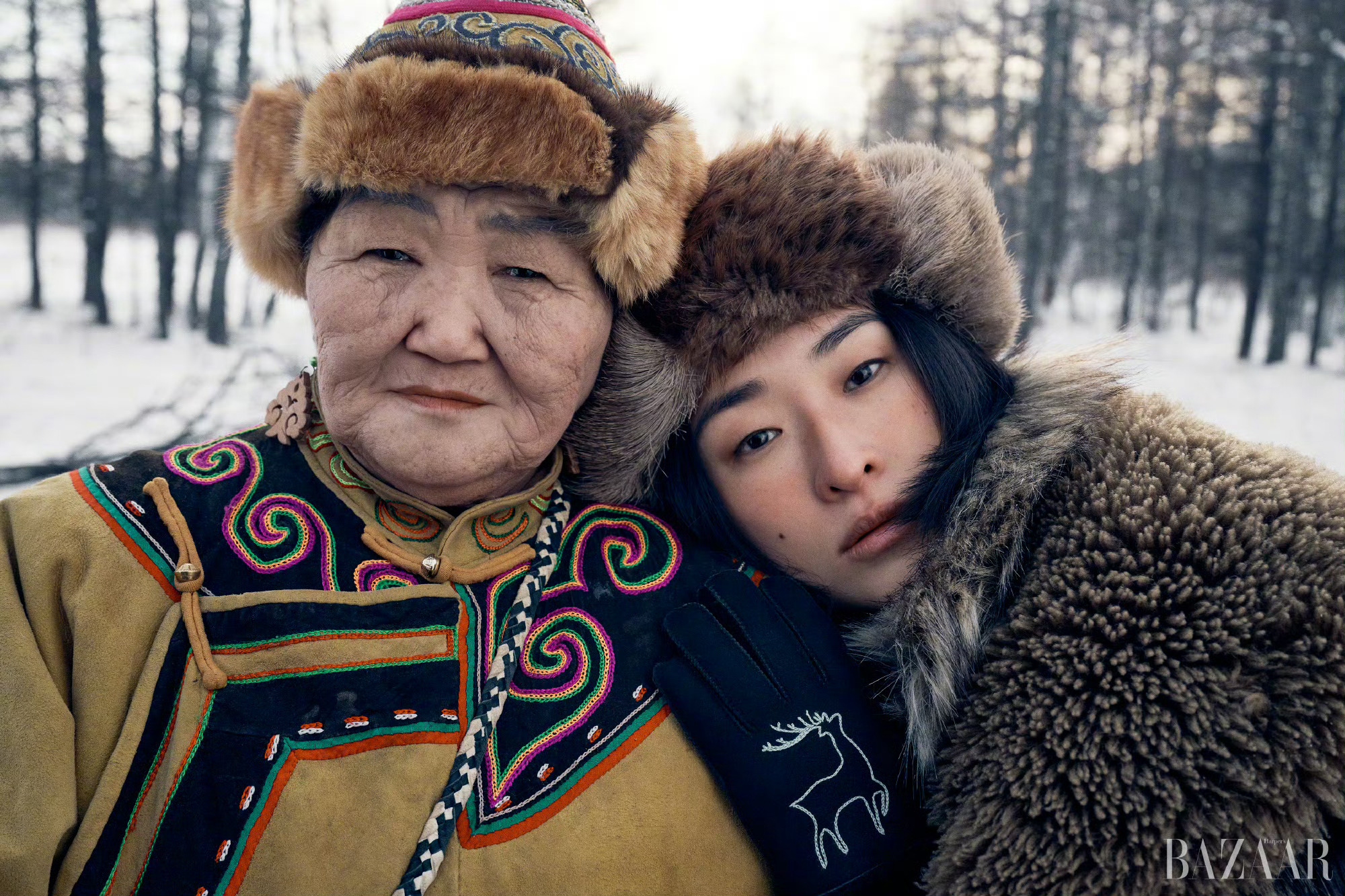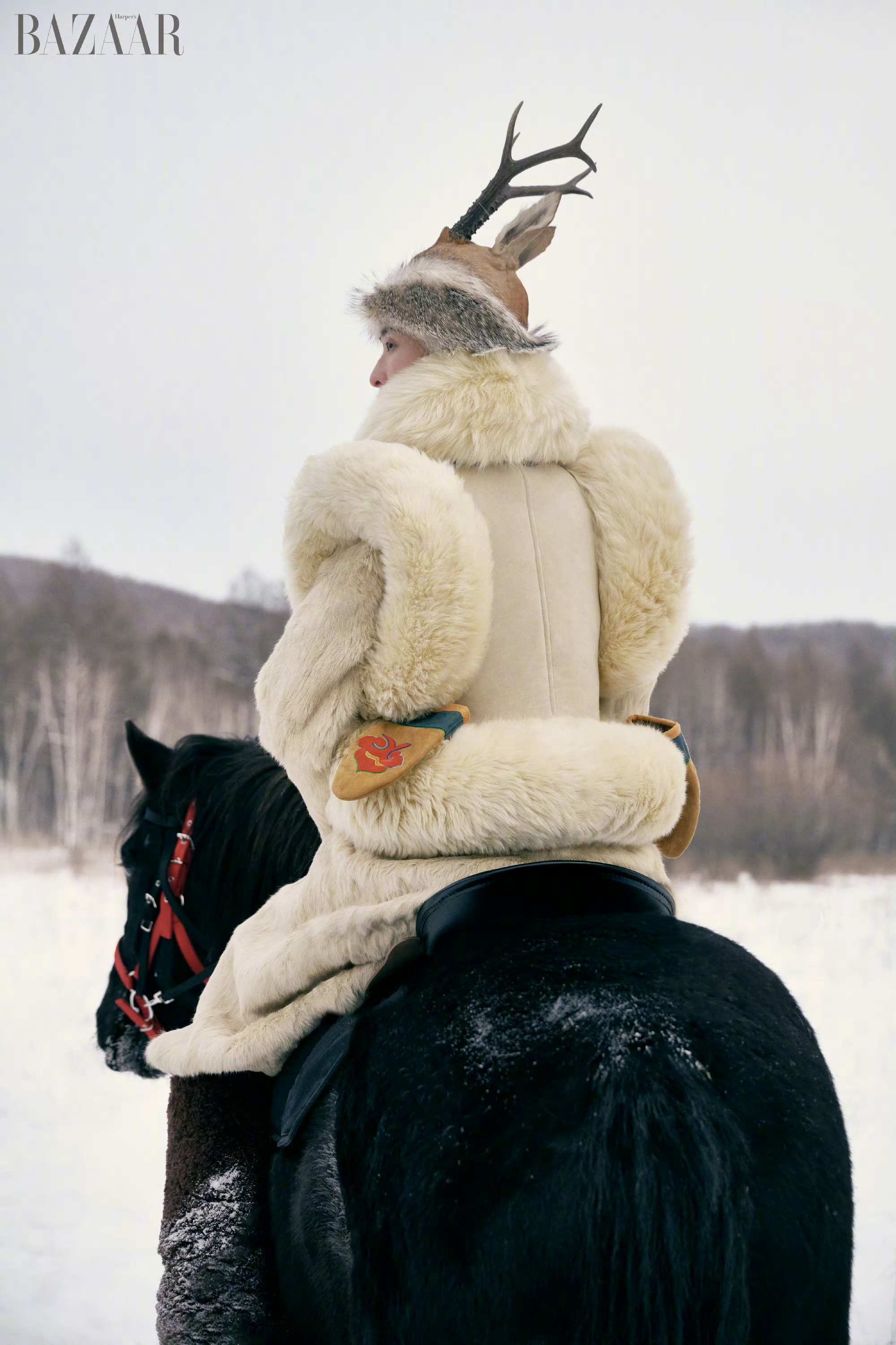 时尚芭莎二月刊汪曲攸游牧之歌芭莎封面大片 在大兴安岭的深处,有一片被白雪与松柏守护的寂静山林。那里,生活着中国北方最后的狩猎民族——鄂伦春。“鄂伦春”这个名字,在古老的通古斯语言里轻轻展开:一说,是“山岭里的人”;又一说,是“使用驯鹿的人”。两种解释,都像一阵温柔的风,从不同的方向吹来,却都指向同一片森林、同一条河流、同一群与猎马并肩的人。摄影/尹超