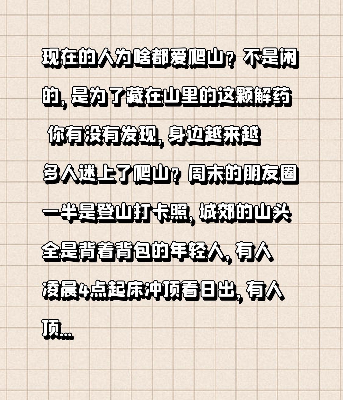 现在的人为啥都爱爬山?不是闲的,是为了藏在山里的这颗解药 你有没有发现,身边越来越多人迷上了爬山?周末的朋友圈一半是登山打卡照,城郊的山头全是背着背包的年轻人,有人凌晨4点起床冲顶看日出,有人顶着烈日走十几公里山路,放着舒服的家不待,为啥大家偏偏爱往山里跑? 有人说爬山是为了锻炼身体,这话不假,可比起健身房的专业训练,爬山累到腿软、汗流浃背,甚至还要面对蚊虫、陡坡,明显不是最优解。真正让大家心甘情愿奔赴的,根本不是爬山本身,而是爬山能让人暂时逃离生活的琐碎。 当代人活得太紧绷了:打工人对着电脑敲一天字,被KPI、加班压得喘不过气;宝妈围着孩子、家务转,连独处的时间都没有;学生党被试卷、成绩裹挟,神经时刻绷着。而山里没有消息提示,没有工作催促,没有家长里短,只有清脆的鸟鸣、清凉的山风,和一眼望不到头的绿意。一步一步往上走,所有的烦恼好像都被甩在了身后,心里的郁结也跟着汗水一起流走了。 这还不是最戳人的,爬山的魅力,藏在那些意想不到的转折里。很多人爬山前总喊着“累死了,再也不来了”,可当咬着牙爬到山顶,看到云海翻涌、日出喷薄,看到脚下的城市变成小小的积木,那一刻的震撼和成就感,能抵消所有疲惫。就像网友说的:“爬山的过程是渡劫,登顶的瞬间是重生。” 更难得的是,爬山让我们重新找回了简单的快乐。不用拼颜值、比财富,大家不分年龄、不分职业,互相喊着加油,帮着拉一把,分享一瓶水、一块面包,陌生人间的善意变得格外珍贵。登顶后一起坐在石头上吹风、聊天,看夕阳把天空染成橘红色,这种不掺任何杂质的开心,在城市里太难找到了。而且爬山的快乐还很“廉价”,不用花大价钱,一双运动鞋、一个背包,就能开启一场治愈之旅,比起逛街、追剧,这份快乐更真实、更长久。 有人说,爬山是成年人的精神避难所,这话一点没错。我们爬的不是山,是被生活困住的自己;我们追的不是日出,是对生活的热爱和期待。在山里,我们能放下焦虑,看清自己的内心,明白人生就像爬山,总有陡坡和弯路,只要一步一个脚印,总能到达想要的高度。 现在的人爱爬山,从来不是因为闲,而是因为我们需要这样一个出口,去释放压力、治愈自己,然后带着满身的阳光和力量,重新回到生活里,勇敢面对所有挑战。毕竟,爬山的意义,从来不是登顶,而是在路上。你最近一次爬山是什么时候?评论区聊聊你在山顶看到的风景~