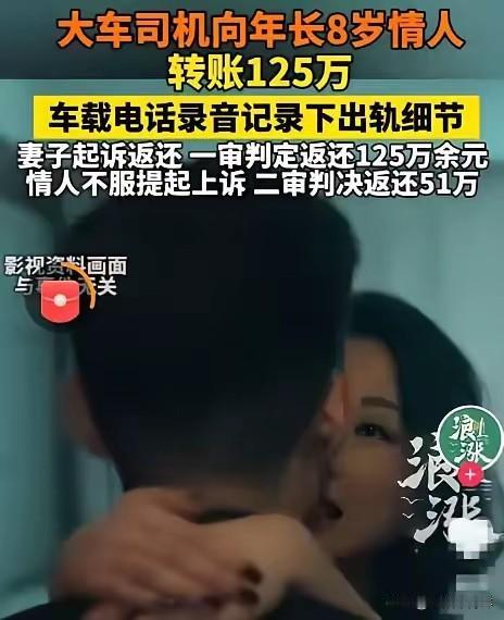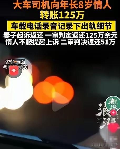 妥妥的被白嫖!内蒙古乌海,一名大车司机因跑长途寂寞,与年长8岁的女子维持了十几年的情人关系。妻子通过车载电话录音发现丈夫称对方为“臭老婆”,才得知自己被背叛。丈夫写保证书求原谅,但妻子查到他给情人转账超125万,怒而起诉第三者要求返还钱款。 大车司机常年跑长途,一个月大半时间都在路上。车就是他的第二个家,也是他藏着秘密的地方。那天妻子去车里拿换洗的衣服,顺手点开了车载电话的录音。原本只是想听听丈夫有没有跟货主沟通运费,结果就听到了丈夫对着电话那头娇嗔喊“臭老婆”的声音。那语气,是她结婚二十多年都没听过的温柔。 她蹲在车边,把那段录音反复听了十几遍。外面的风刮得脸疼,她却感觉浑身发冷。回到家,她把录音甩在丈夫面前,男人当场就慌了,又是扇自己耳光又是写保证书,说只是跑长途太孤单,一时糊涂,以后绝不再犯。她看着那张写满“保证”的纸,心里却只剩冰凉。 没几天,她就拿着丈夫的银行卡流水去了银行。一笔笔转账记录跳出来的时候,她的手都在抖。从几千到几万,十几年下来,累计超过125万。这些钱,是丈夫熬夜跑运输、吃泡面啃干粮攒下的血汗钱,也是她在家带孩子、照顾老人省出来的生活费。现在全成了情人的零花钱。 她没再跟丈夫吵,直接把第三者告上了法庭。一审法院认定这些转账属于夫妻共同财产,判决情人全额返还125万余元。本以为这事就这么了结,没想到情人不服,居然提起了上诉。二审时,情人拿出了一些聊天记录和小额消费凭证,说部分钱是司机自愿给她的生活费,还有一些是两人共同旅游的开销。法院最终改判,只让她返还51万。 这个结果让很多人不解。明明是出轨转账,凭什么不全额返还?说白了,就是因为有些转账没有明确标注“借款”或“赠与”,加上时间跨度太长,部分资金的用途难以界定。这也给所有夫妻提了个醒:共同财产不是一个人的小金库,别以为偷偷转出去就没人发现。 现实里,不少跑长途的司机都会因为孤独找个临时伴侣。但像这位司机一样,一找就是十几年,还转这么多钱的,真不多见。他以为自己是在找情感寄托,其实是在用夫妻共同财产养别人,最后不仅伤了老婆的心,还让自己人财两空。 更可笑的是那个情人,拿了别人的钱,还觉得理所当然。真以为靠着几句甜言蜜语就能把别人的血汗钱据为己有?法律不会纵容这种不劳而获的行为,哪怕二审只判返还51万,也足以让她明白,不属于自己的东西,终究要吐出来。 各位读者你们怎么看?欢迎在评论区讨论。