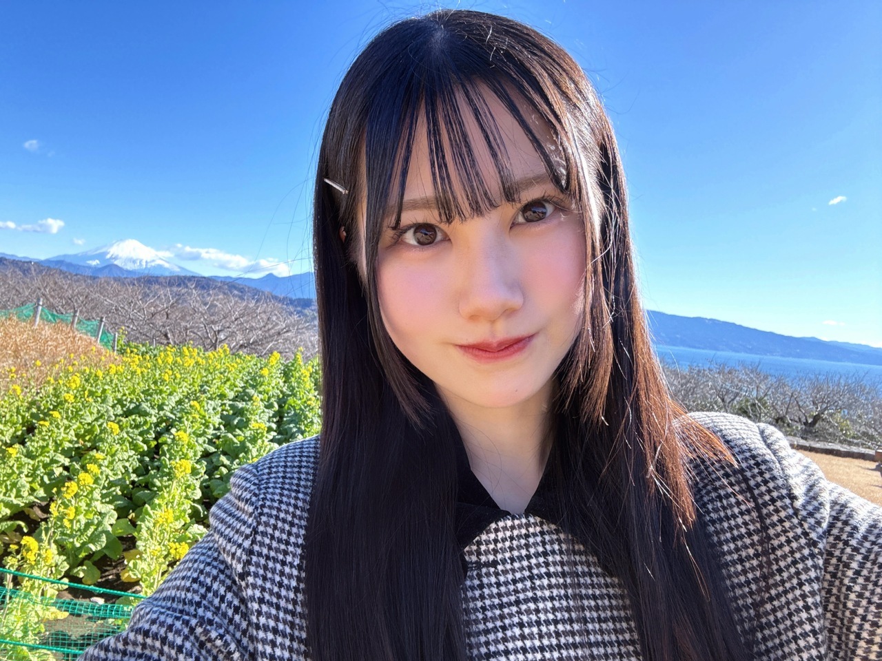鶴崎仁香「お正月休みに、二宮町にある吾妻山公園に行ってきたよ〜〜🌼🤍お披露目の動画を撮ったとき以来に訪れたのですが、1月なのにもうっすらと菜の花が咲いていてとっても綺麗でした(˶'ᵕ'˶ )︎あの時は1人で撮影したことも、それがお披露目の動画ということも、全てがドキドキで緊張していたので、今回はその分じっくりと景色を堪能できて嬉しかったです🗻」