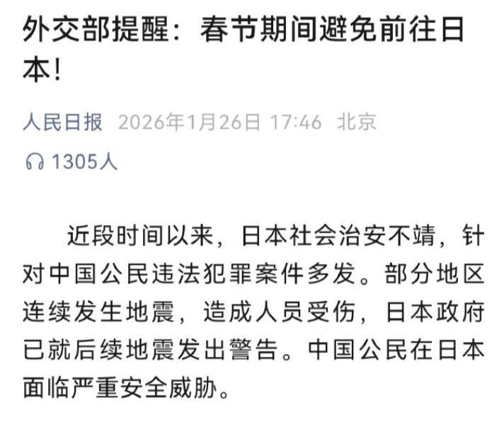 大家信不信,哪怕有外交部的旅行警告,一定仍会有不少人前往日本,而且还会有人发出挑衅式言论。我倒是觉得,对于这帮人就不应该给它们选择,直接禁了赴日游就行了,不给赴日旅游发签证一了百了。 先把话说透:现在的日本不是旅游目的地,是实打实的军事对峙前沿。2025年日本在九州到冲绳的岛链上,计划部署射程1500公里的改进型12式导弹,400枚战斧导弹正在分批交付——这些武器的瞄准镜,明晃晃对着东海舰队的母港。 当日本自卫队把"攻击中国军舰"写进作战手册,当他们的F-35战机开始模拟对中国航母编队的突袭,赴日旅游的每一张机票钱,都可能变成冲绳岛上的一枚导弹零件。 看看最新数据,哪怕12月外交部发出提醒后,仍有几十万中国人在日本消费。 这些数字背后是两类人:一类是被"樱花季""免税店"洗脑的普通游客,另一类是揣着"反串挑衅"心思的极端分子。 前者可能不知道,他们打卡的冲绳美军基地观景台,正是日本部署反舰导弹的核心阵地;后者更清楚,在靖国神社前举五星红旗拍照的"行为艺术",本质是给日本右翼递刀子——2024年就发生过中国游客在大阪公开播放南京大屠杀影像,被右翼团体围堵的事件,这种行为只会让日本社会对华敌意具象化。 关键问题在于,日本的军事冒险已经突破"擦边球"范畴。2026年初他们的宙斯盾舰开始搭载射程900公里的反舰导弹,出云级航母改装后能起降14架F-35,这些动作不是防御,是典型的"先手攻击"布局。 更直白地说,一旦台海有事,日本西南诸岛会立刻变成美军的前沿弹药库——2025年美军在关岛的弹药储备,有40%已经前置部署到冲绳。 这时候去日本旅游,无异于在火药桶边玩火:2024年南海演习,中国电子战部队曾让美军F-35机群73%偏离航线,这种对抗强度下,游客聚集的东京、大阪极可能成为误击目标。 再说经济账。2025年前三季度中国游客在日消费37亿美元,这笔钱很大一部分流向了日本军工产业链。三菱重工的导弹工厂、川崎重工的F-35组装线,背后都有旅游收入的间接输血。日本2025年防卫预算8万亿日元,相当于每个赴日游客贡献了1200元人民币的"防卫税"。 更讽刺的是,那些在社交媒体炫耀"日本治安好"的游客,可能不知道成田机场安检人员盗窃中国游客的案件,破案率不到30%——因为右翼势力默许针对中国人的"轻微犯罪",这种系统性歧视,本质是对华敌意的日常化。 最危险的是认知错位。有人觉得"去旅游是个人自由",却忽略了2025年日本新版《防卫白皮书》已经把中国定义为"最大战略挑战"。当日本首相公开宣称"台湾有事即日本有事",当他们的军事专家在推演"72小时瘫痪中国东海舰队",赴日旅游就不再是背包客的私事。 想想2022年俄乌冲突爆发时,滞留在哈尔科夫的中国留学生,国家动用多少资源才接回来?现在日本西南诸岛的导弹阵地,离台湾直线距离不到300公里,真到擦枪走火那天,谁来保证几千公里外的游客安全? 数据不会说谎:2025年12月赴日中国游客骤降45%,但仍有33万人前往,这个数字超过很多中等城市的人口。 这些人里,有的是被"日元贬值""机票白菜价"吸引的务实派,有的是沉迷"二次元文化"的年轻人,可他们没意识到,日本旅游业正在把中国人的钱包,变成对抗中国的"战略缓冲"。 2025年日本旅游收入4000亿人民币中,15%来自中国游客,这笔钱被用来补贴西南诸岛的军事基建——冲绳那霸港的深水码头,既是游轮母港,也是战时导弹补给站。 最后说个现实:2026年1月石川县地震后,中国游客在灾区求救时,日本自卫队优先救援本国居民,导致3名中国公民被困7小时。这种"平时笑脸相迎,战时自生自灭"的逻辑,恰恰暴露了赴日旅游的本质风险。 当日本把"中国威胁论"写进教科书,当右翼团体在旅游区散发反华传单,还坚持要去的人,要么是对局势一无所知,要么是揣着糊涂装明白。集体安全面前,个人"说走就走"的自由,从来都不是无条件的。