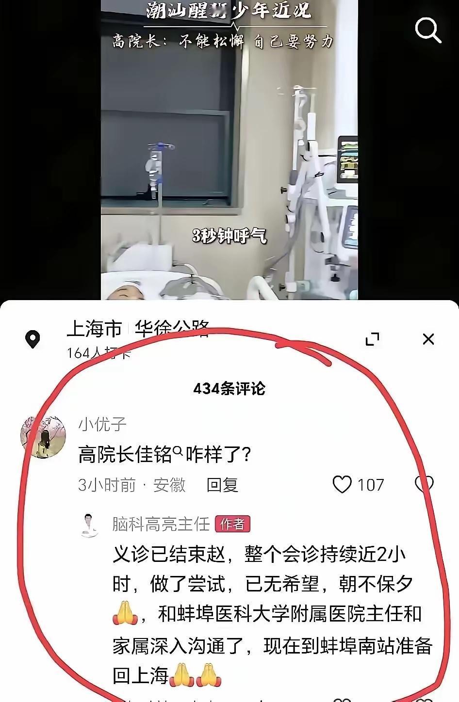 泪目!安徽蚌埠14岁男孩陈佳铭,12月16日下午课间和同学打闹,被绊倒后脑着地,当场昏迷,班主任一分钟赶到,同学忙着按压胸口但没做口对口,25分钟后救护车到,医院说是重伤,孩子一直躺到1月26号还没醒。1月25日上海一位专做这类抢救的院长赶来,会诊做了拍血管的片子和脑电的检查,七十多分钟,看完就去了蚌埠南站赶车。 事发当天下午的课间,教室里格外热闹,陈佳铭和同学在过道上追逐打闹,脚步没站稳被绊倒,身体重重摔在水泥地上,后脑率先着地发出闷响,他连哼都没哼一声就倒在地上没了动静。周围同学瞬间慌了神,有人吓得尖叫,有人赶紧围过来,几个胆大的同学立刻蹲下身查看,发现他双目紧闭、呼吸微弱,下意识伸手按压他的胸口,却因为紧张和急救知识的欠缺,忘了做口对口人工呼吸,只一遍遍机械地按压,嘴里不停喊着佳铭的名字。 班主任李老师刚回到办公室喝了口水,就听到教室方向传来骚动,她心里一紧,快步冲了过去,整个过程刚好一分钟。看到倒在地上昏迷的陈佳铭,李老师强压着慌乱,第一时间拨打了120急救电话,清晰报出学校地址和孩子的情况,又立刻联系陈佳铭的父母,电话里声音都在发抖。她让围观同学散开保持空气流通,接过同学的手规范按压孩子胸口,一边按压一边轻声呼唤,盼着能有回应,可陈佳铭始终毫无反应,小小的身子躺在地上,看得人心揪得慌。 等待救护车的25分钟,每一秒都格外漫长。李老师一直没停下手,胳膊酸了就换个姿势继续,周围的同学有的默默抹眼泪,有的守在门口等着引导救护车,整个班级都被沉重的氛围笼罩。救护车赶到后,医护人员迅速给陈佳铭做了初步急救,抬上担架送往医院,李老师安排好班里的事,紧跟着救护车赶往医院,一路上都在给孩子父母发定位,心里祈祷着孩子能平安无事。 医院检查结果很快出来,重度颅脑损伤,需要立刻进重症监护室抢救。陈佳铭的父母赶到医院时,看到躺在病床上浑身插满管子的儿子,当场崩溃大哭,母亲更是差点晕倒,父亲强撑着冷静办理各项手续,日夜守在重症监护室外,不敢离开半步。每天早上他们都会隔着玻璃跟孩子说话,讲家里的事,讲学校的趣事,盼着孩子能听到动静睁开眼睛,可日子一天天过去,陈佳铭始终处于昏迷状态,没有丝毫苏醒的迹象。 这一个多月里,李老师几乎每天都会抽时间去医院探望,带去班里同学写的祝福卡片,每张卡片上都写着“佳铭快醒醒,我们等你回教室上课”“佳铭,你还要跟我们一起参加期末考试”。班里的同学也常常让家长帮忙转达问候,大家都盼着这个活泼开朗的男孩能早日归队。当地医院多次组织会诊,调整治疗方案,可孩子的情况始终没有明显好转,医生建议家属联系外地权威专家,或许能有新的希望。 陈佳铭的父亲通过多方打听,辗转联系到上海这位专攻颅脑损伤抢救的院长,说明孩子的情况后,院长当即答应赶来会诊。1月25日当天,院长推掉手头预约好的工作,坐最早的高铁赶往蚌埠,抵达医院后没来得及休息,立刻投入会诊。他仔细查看孩子之前的所有检查报告,亲自带着孩子做血管造影和脑电检查,全程紧盯片子细节,时不时跟当地主治医生沟通病情,分析昏迷原因和后续治疗方向,七十多分钟的会诊全程专注,没有半点敷衍。 会诊结束后,院长把详细的治疗建议和注意事项一一交代清楚,又反复叮嘱医护人员重点关注的指标,才匆匆赶往蚌埠南站赶返程高铁。他没留下任何联系方式,也没接受家属的任何感谢,只说希望孩子能早日醒来,有需要随时可以联系他远程指导。陈佳铭的父母握着院长的手,哽咽着说不出话,只能一遍遍鞠躬道谢,这份素不相识的善意,成了他们灰暗日子里的一束光。 截至1月26日,陈佳铭依旧处于昏迷状态,父母依旧日夜守在病床前,每天坚持给孩子按摩身体、轻声呼唤,学校也安排老师轮流帮忙照看,班里的同学还在盼着他回来。大家都知道,颅脑损伤的苏醒需要时间和耐心,可所有人都没放弃,都在默默为这个14岁的男孩祈祷,盼着奇迹能早日出现,盼着他能睁开眼睛,再喊一声爸爸妈妈,再回到熟悉的教室。 每一个孩子的平安成长都牵动着无数人的心,校园意外让人痛心,而身边人的及时援手、医者的仁心相助、师生的牵挂期盼,都藏着最温暖的力量,这份不放弃的坚守,终会等到希望降临。 各位读者你们怎么看?欢迎在评论区讨论。