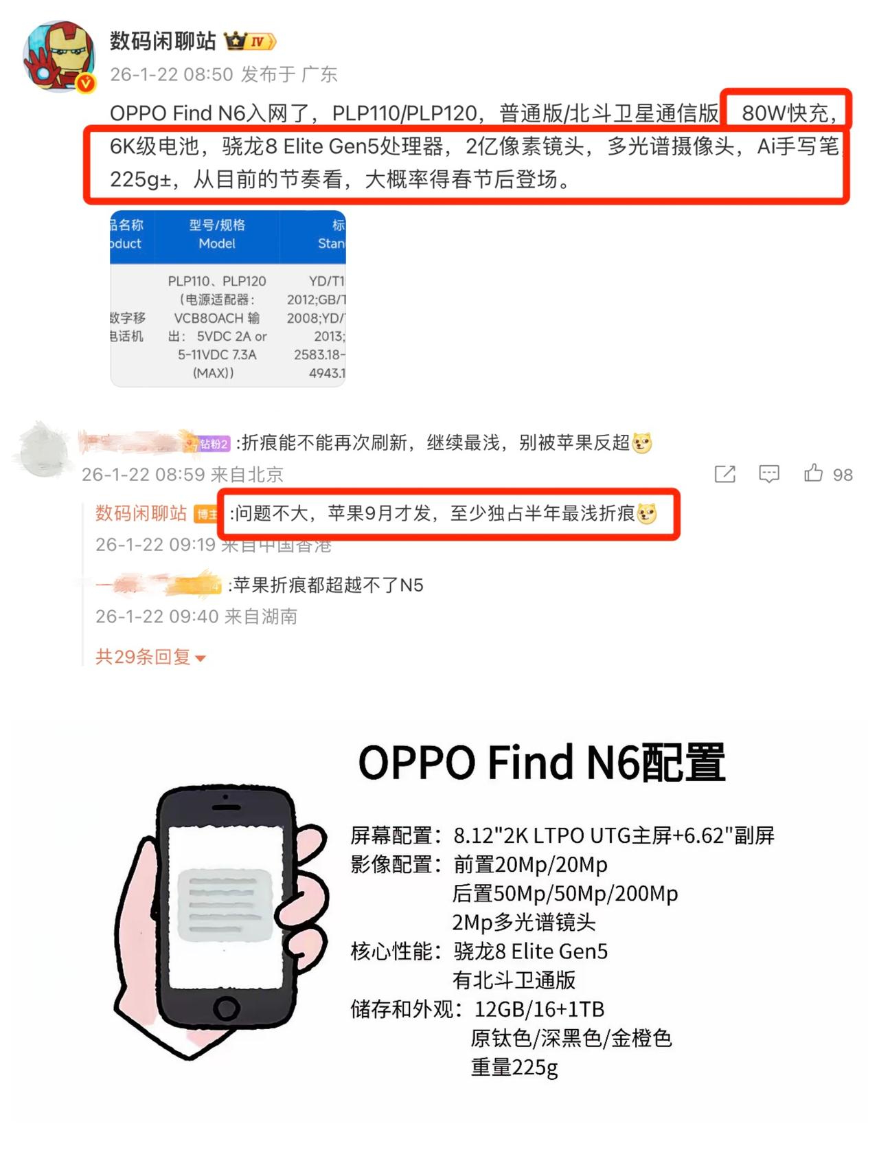 一直搞不懂为什么苹果26年才出折叠屏??? 这两天关于iPhone Fold的消息越来越多,看来今年苹果是真的要上折叠屏这条船了?苹果这动作可真够慢的,三星华为OPPO这些厂都入局好几年了,这波好饭也忒晚了。。。 不过要我说,苹果之前不做,不是没能力,是太挑剔了。毕竟苹果的品控要求高,想要真正无折痕的平整折叠屏,铰链耐用度、机身厚度,甚至软件生态的适配,它都想做到自己满意才拿出来。加上折叠屏技术高,量产良品率难把控,苹果也怕砸了口碑。结果就是,苹果一边观望安卓一边发展,结果安卓反而通过几代产品的迭代,解决了一个又一个问题,形成了技术护城河。 看看最近的爆料,OPPO的下一代大折叠旗舰Find N6,配置堆得就挺猛,处理器直接用上骁龙8 Elite Gen5,上了2亿像素,还有80W快充、6K级电池,重量居然控制在225g左右,这比一些直板旗舰还轻。 最关键的是,据传OPPO在铰链和折痕控制上又有新突破,难怪之前有消息传出苹果都偷偷买OPPO Find N5拆解研究了,看来Find N6很可能成为首款实现“视觉无折痕”的折叠屏手机(据传苹果用的就是OPPO同样的产线),而且据说OPPO这项技术至少能领先独占半年!如果真是这样,那等到苹果慢悠悠拿出产品时,面对的可能已经是一个技术相当成熟、且体验门槛更低的战场了。 所以说大家看好苹果的折叠屏吗?觉得它能后来居上,还是国产手机会继续领跑? 数码爱好者折叠屏OPPO Find N6iPhoneiPhone Fold