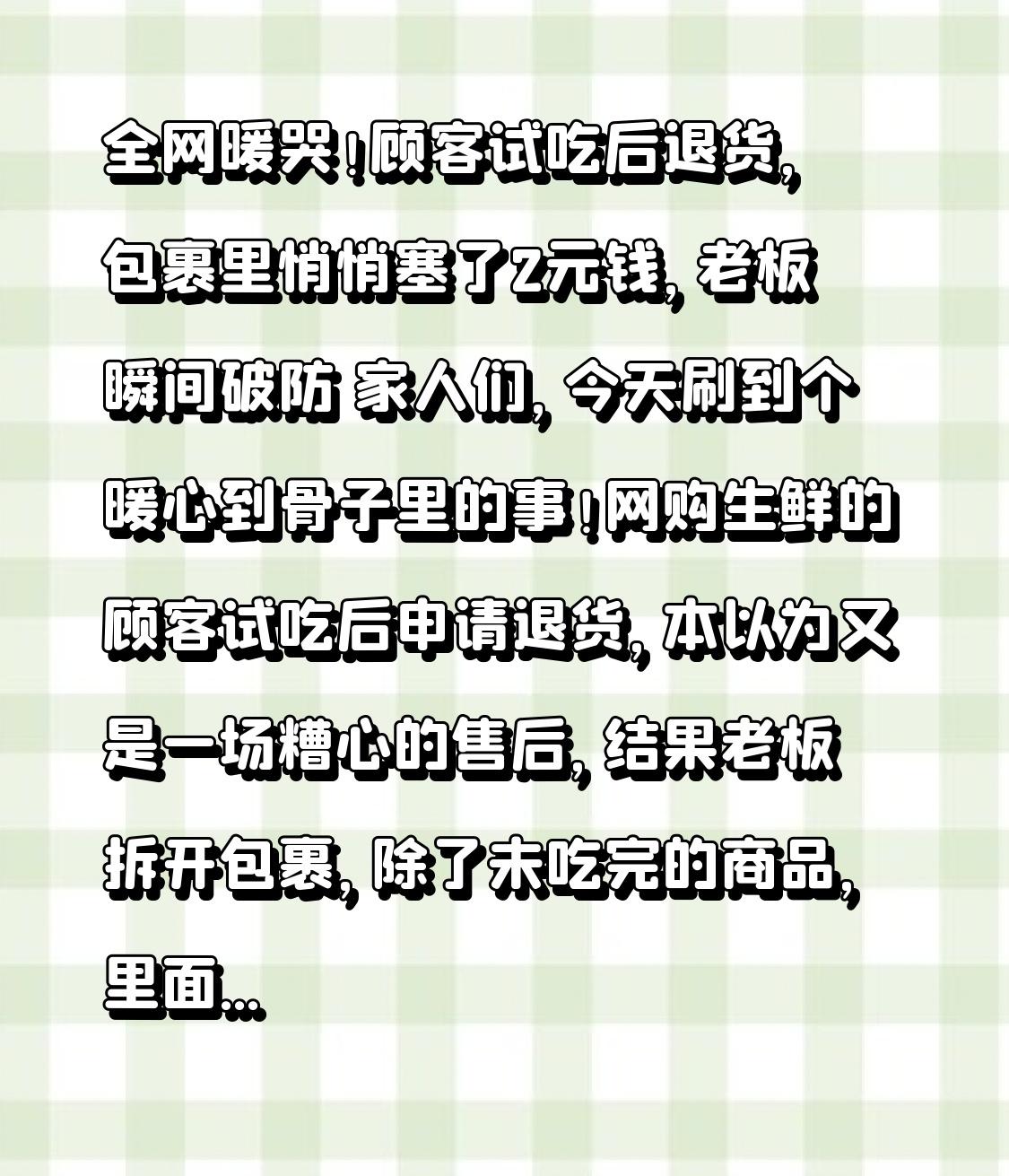 全网暖哭!顾客试吃后退货,包裹里悄悄塞了2元钱,老板瞬间破防 家人们,今天刷到个暖心到骨子里的事!网购生鲜的顾客试吃后申请退货,本以为又是一场糟心的售后,结果老板拆开包裹,除了未吃完的商品,里面还静静躺着2块钱现金,附了张小字条:尝了一点,付个试吃费,麻烦了!这波操作,直接让老板红了眼眶,也暖透了全网! 这事发生在山东一位果蔬店老板身上,他在网上卖现摘的草莓干和芒果干,都是小包装现做的,主打一个新鲜。前几天收到一个退货订单,买家备注“口味不太合心意,申请退货”,老板本来没当回事,做生鲜电商,退货换货是常事,甚至偶尔会遇到试吃后全额退货的顾客,心里多少会有点膈应,但也都会按规则处理。 可拆开退货包裹的那一刻,老板直接愣住了,这就是最戳人的转折点!退回的果干少了一小包,看得出来是尝过了,而包裹角落,用纸巾包着两枚崭新的一元硬币,还有一张手写的小纸条,字迹娟秀,寥寥数语却格外真诚。老板说,当时心里又暖又酸,做电商这么多年,见过薅羊毛的、无理取闹的,却第一次遇到这样细心又有分寸的顾客,那2块钱不值钱,可这份尊重和体谅,比什么都珍贵。 他随手把这个画面发到网上,没想到瞬间火了,评论区直接被暖评刷屏。有人说“这2块钱,是刻在骨子里的教养”,有人说“试吃本无可厚非,但这份自觉,真的太难得”,还有不少网友分享自己的经历:买零食尝了一口不合口味,哪怕能七天无理由,也会直接留下,不麻烦商家。当然也有人感慨,对比那些把商品吃空大半再退货、甚至故意找茬薅羊毛的买家,这位顾客的举动,真的是一股清流。 其实这事儿看似小事,却藏着人与人之间最珍贵的分寸感。网购的便利背后,是买卖双方的相互信任,商家用心做好产品,买家体谅商家的不易,哪怕不合心意,也守住基本的底线。老板后来不仅全额退款,还主动给这位顾客寄了一大箱新品果干,说“这份心意,必须回礼”,一来一回的双向奔赴,更是把这份温暖拉满。 我们常说,细节见人品,小事见教养。这2块钱,不是一笔交易,而是一份换位思考的温柔,是不占小便宜的自觉。在这个快节奏的时代,这样的小美好,总能轻易治愈我们的疲惫,也让我们相信,人与人之间的善意,从来都不会缺席。 你在网购时遇到过这样温暖的瞬间吗?或者见过哪些让人膈应的薅羊毛行为?评论区聊聊,也让这份善意传递下去!