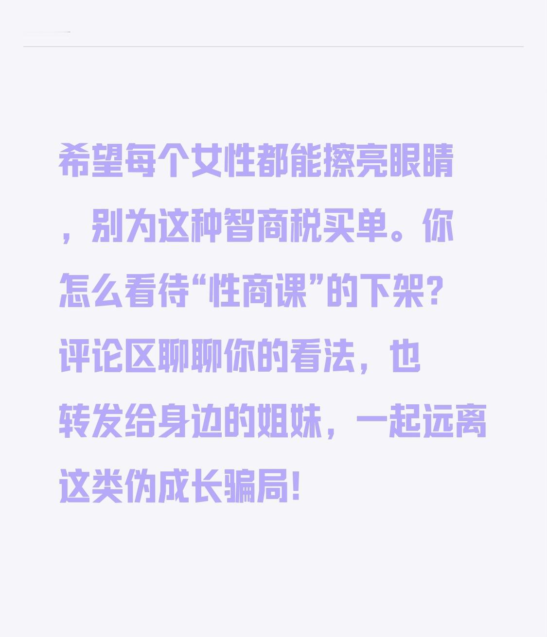 封杀!8.8万性商课多处下线,教女性摆X型勾人,实则割韭菜 家人们刷到过“眼神给出去,身体呈X型”的魔性视频吗?自称“性商教母”的网红周媛,靠着这套擦边话术把线上课卖到8.8万天价,学员超万人、营收破2400万,可最近却被全网封杀,多个平台课程集体下线,这门离谱的生意到底藏着多少坑? 先给大家扒扒这门课有多颠覆三观!周媛的“黑白颠性商学苑”套路一套接一套:9.9元引流课教“狐系媚术”,999元进阶班学“暧昧话术”,线下两天两夜训练营卖2999元,三天三夜飙到4980元,最顶级的“导师私定班”直接喊价8.8万,宣称能“绑定男性、实现轻创业分成”。光看课程内容就离谱,什么“丝袜诱惑技巧”“浴室暧昧玩法”,甚至还有“道家媚术”,本质全是教人取悦男性的低俗套路,被网友吐槽“比小三培训班还过火”。 可就是这样的课程,居然吸引了上万人报名,学员从二十多岁的单身女性到五十多岁的已婚阿姨都有。为啥有人愿意花大价钱踩坑?核心就是抓住了女性的情感焦虑——婚姻危机想挽回老公、单身久了怕没人要、自我认同低想靠异性认可找价值,周媛们精准拿捏这份恐慌,用“学完就能掌控感情”“改变命运”的话术画大饼,让受害者以为花了钱就能摆脱困境。 转折点来得猝不及防!随着“X型站姿”视频全网刷屏,质疑声越来越大。有学员学完回家实操,被丈夫怒斥“不正经”直接提出离婚;还有人花8.8万报了顶级班,结果只学到些摆拍技巧,想退钱却被拒绝。更离谱的是,课程宣称的“国家心理咨询师资质”纯属造假,该认证早在2017年就已取消,所谓“创业分成”更是涉嫌传销,拉新学员能拿30%分润,完全是靠收割下线赚钱。 《中国妇女报》直接发文痛批,指出这类课程是“开性别平等的倒车”,把女性物化成取悦工具,违背公序良俗。随后平台迅速出手,周媛多个社交账号被永久封禁,线上课程全面下架,可让人震惊的是,线下课程居然还在偷偷运营,长沙总部每月开十多场,厦门、西安等地还在拓展分校,报名要提前10天预约,简直顶风作案。 其实这类“伪成长”骗局早有苗头,有的打着“两性健康”旗号卖三无私密产品,宣称能“紧致抗衰”,实则可能导致感染溃烂;有的推出“情欲觉醒营”,教所谓“床榻36式”,游走在色情擦边的灰色地带。它们都有个共同点:披着“女性赋能”的外衣,实则贩卖焦虑,让女性陷入“只有取悦男性才值钱”的误区。 真正的女性成长,从来不是靠眼神勾人、姿势讨好,而是源于独立的人格、清醒的认知和过硬的能力。我们好不容易挣脱“三从四德”的枷锁,没必要再给自己套上“取悦他人”的新枷锁。平台封杀这类课程,不仅是净化网络环境,更是守住了性别平等的底线。 希望每个女性都能擦亮眼睛,别为这种智商税买单。你怎么看待“性商课”的下架?评论区聊聊你的看法,也转发给身边的姐妹,一起远离这类伪成长骗局!