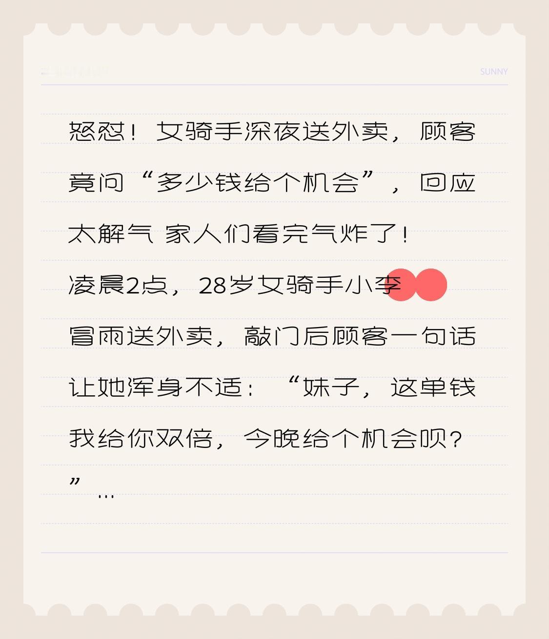 怒怼!女骑手深夜送外卖,顾客竟问“多少钱给个机会”,回应太解气 家人们看完气炸了!凌晨2点,28岁女骑手小李冒雨送外卖,敲门后顾客一句话让她浑身不适:“妹子,这单钱我给你双倍,今晚给个机会呗?” 面对赤裸裸的骚扰,小李的回应又刚又飒,网友直呼“干得漂亮”,这事儿到底有多气人? 小李是江苏苏州的一名外卖骑手,为了多赚点加班费,经常跑深夜订单。事发当晚下着小雨,气温只有3℃,她骑着电动车跑了20多分钟,浑身湿漉漉地赶到顾客小区,爬了6楼才送到外卖。本来想着赶紧送完下一单,可敲门后,门只开了一条缝,里面的男子醉醺醺地盯着她,说出了那句露骨的话,还伸手想拽她的胳膊。 小李瞬间愣住了,第一反应是害怕,毕竟深夜孤身一人在陌生楼道,对方又是醉酒状态。她下意识往后退了一步,紧紧攥着车钥匙当防身工具,这是第一个转折点——她没有选择忍气吞声,而是强装镇定怼了回去:“大哥,我是来送外卖的,不是来卖的!你尊重别人,也尊重你自己!” 说完转身就走,还不忘拍下对方门牌号,怕后续被纠缠。 更让人气愤的是,男子还在背后叫嚣:“装什么清高,跑外卖不就是为了钱吗?给你500够不够?” 这句话彻底点燃了小李的怒火,她停下脚步回头喊道:“我凭力气赚钱不丢人,你这种不尊重人的样子才最恶心!” 随后她立刻联系平台客服投诉,还把事情经过发到了骑手群里,没想到很快引发全网关注。 转折点来了!平台核实情况后,不仅永久封禁了该顾客的账号,还补偿了小李200元精神损失费,承诺会加强夜间订单的安全保障。网友们更是一边倒支持小李,有人说“这才是女性该有的底气”,有人分享自己的经历:“之前送外卖被顾客调侃‘要不要进来喝一杯’,当时没敢反驳,现在后悔没像她一样硬气”,还有骑手晒出平台新出的“安全一键报警”功能,说终于有了安全感。 其实女骑手遭遇骚扰的情况并不少见。有骑手被顾客索要微信,拒绝后就被恶意差评;有人送单时被尾随,只能绕路回家;还有人被问“陪聊一小时加多少钱”,这些看似“玩笑”的话,本质都是对劳动者的不尊重。她们风里来雨里去,靠自己的双手赚钱,不该承受这些额外的伤害。 小李说,她之所以敢反击,是因为知道自己没做错,“我跑外卖是为了养活自己和家人,每一分钱都干干净净,凭什么要被这样侮辱?” 这句话戳中了无数打工人的心。无论是外卖骑手、快递员,还是保洁阿姨、服务员,每一份职业都值得尊重,每一个靠劳动谋生的人都不该被轻视。 职场没有高低贵贱,只有分工不同。希望每个劳动者都能被温柔以待,也希望遇到骚扰时,大家都能像小李一样勇敢说不。你身边有类似的经历吗?评论区聊聊你的看法,也别忘了转发给身边的打工人,一起为尊严发声!