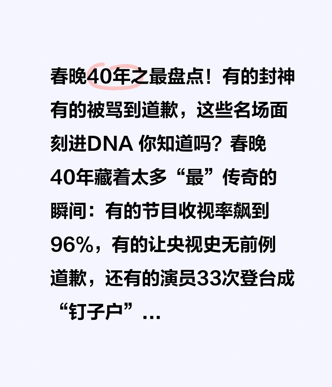 春晚40年之最盘点!有的封神有的被骂到道歉,这些名场面刻进DNA 你知道吗?春晚40年藏着太多“最”传奇的瞬间:有的节目收视率飙到96%,有的让央视史无前例道歉,还有的演员33次登台成“钉子户”!这些历届春晚的“天花板”与“名场面”,不仅是舞台记忆,更是几代人的团圆符号。 要说最“长青”的节目,非《难忘今宵》莫属!从1984年首次唱响,断断续续陪伴观众32年,李谷一的歌声成了春晚谢幕的标配,独唱、大合唱换着花样,却永远能勾起“年要过完了”的复杂情绪,堪称“国民谢幕曲”。而最“出圈”的歌曲,1987年费翔的《冬天里的一把火》必须拥有姓名,劲歌热舞点燃全国,让他一夜爆红,连当年的磁带都卖到脱销,至今仍是怀旧金曲TOP1。 小品界的“收视王者”更是神仙打架!1989年《懒汉相亲》以96%的收视率创下纪录,魏淑芬“至今未婚”的台词传遍大街小巷;赵本山21次登台,从《卖拐》的“走两步”到《不差钱》的“人生最痛苦的事”,几乎年年拿小品类一等奖,成了春晚“小品王”的代名词。但最让人意外的是,1984年陈佩斯、朱时茂的《吃面条》,竟是春晚史上第一个小品,两人即兴发挥的吃面条名场面,直接开创了小品这个节目品类。 可春晚也有“最翻车”的一届!1985年春晚堪称“事故现场”:美猴王吊威亚撞柱子、杂技演员高空被缠脚、陈佩斯冻到下台送医,更因陈冲的不当发言引发众怒,最后央视竟在《新闻联播》公开道歉,这也是唯一一次春晚道歉事件。而最“催泪”的节目,2005年《千手观音》绝对封神,6分钟表演收获10次掌声,聋哑演员们的完美演绎,让全国观众感动落泪,成为春晚最具正能量的经典。 舞台背后还有最“拼”的老艺术家!赵丽蓉在《打工奇遇》结尾悬腕写下“货真价实”,谁能想到她从小唱戏根本不会写字,为这四个字苦练数月,瞒过了全国观众;1995年《如此包装》里,她腿伤发作险些摔倒,却硬撑着演完谢幕,这份敬业至今让人动容。而最“执着”的演员,冯巩以33次登台傲居榜首,一句“我想死你们了”成了固定开场白,33年风雨无阻,陪伴观众度过一个个除夕。 从1983年第一届的即兴点播,到后来的AR舞台、跨屏互动,春晚的“最”在不断刷新:最“大胆”的融合是2016年《华阴老腔一声喊》,摇滚混搭非遗;最“神奇”的魔术是2009年刘谦的《魔手神彩》,“见证奇迹的时刻”成了流行语;最“治愈”的合唱是1998年那英、王菲的《相约九八》,两大天后同台,成了香港回归后的温情记忆。 其实这些“最”背后,藏着的是春晚的初心:用舞台记录时代,用欢笑连接团圆。不管是高收视的经典,还是翻车的意外,不管是老艺术家的坚守,还是新节目 的创新,春晚早已不是单纯的晚会,而是除夕夜的“仪式感”。 40年春去秋来,舞台在变、节目在换,但围坐看春晚的家人、刻在记忆里的名场面,从未改变。这些历届春晚的“之最”,你最难忘哪一个?评论区聊聊你的春晚独家记忆~