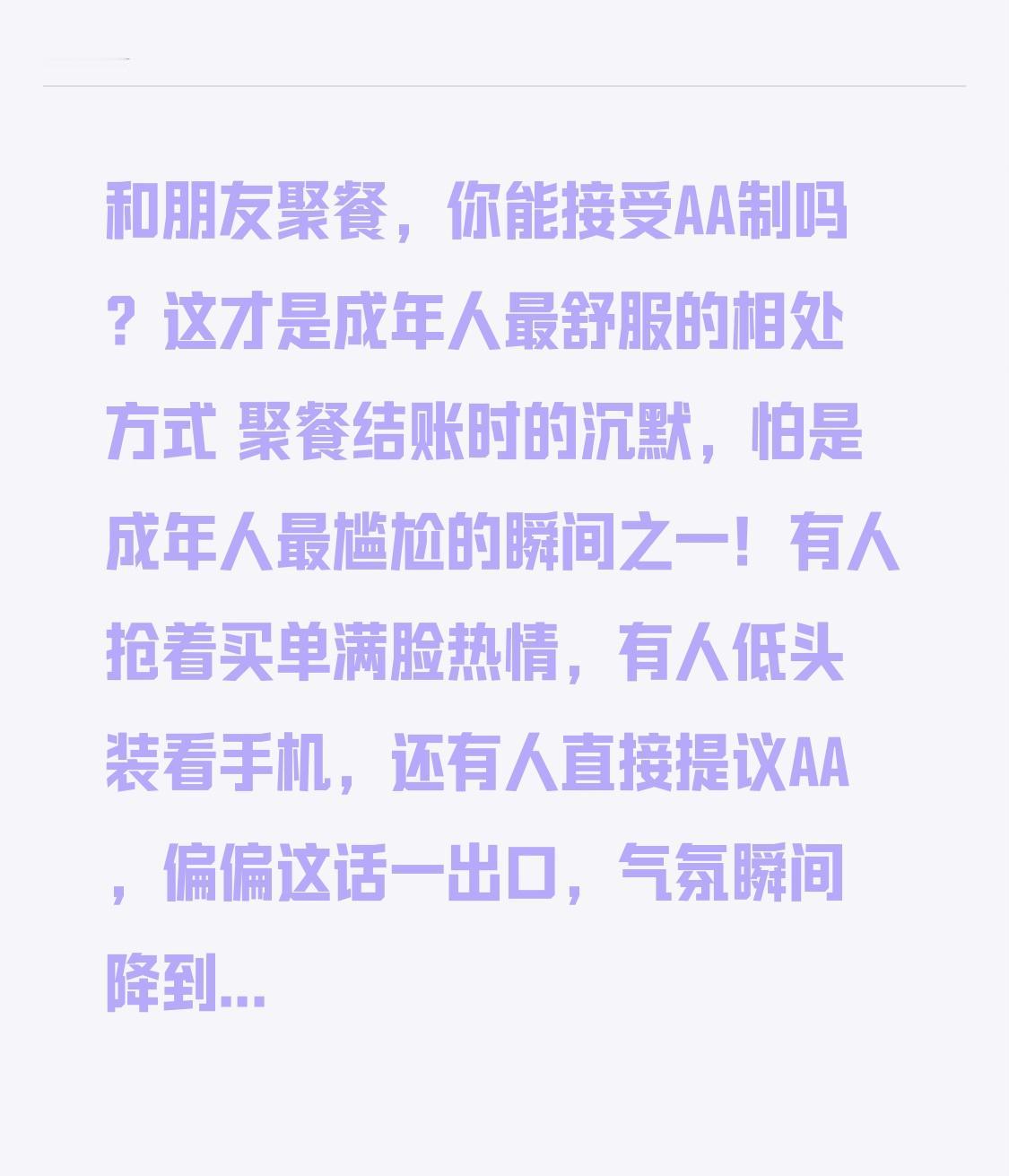 和朋友聚餐,你能接受AA制吗?这才是成年人最舒服的相处方式 聚餐结账时的沉默,怕是成年人最尴尬的瞬间之一!有人抢着买单满脸热情,有人低头装看手机,还有人直接提议AA,偏偏这话一出口,气氛瞬间降到冰点,甚至有人觉得“提AA就是小气,没把我当朋友”。和朋友聚餐到底该不该AA?为啥越来越多人宁愿AA,也不愿再搞人情账? 说起聚餐买单,相信大家都有过这样的经历:闺蜜小聚,每次都是你抢着买单,次数多了对方习以为常,偶尔一次没付钱,就被甩脸子说“你是不是抠门了”;朋友聚会,有人专挑贵的点,结账时却装傻,最后只能几个人硬着头皮平摊,心里憋屈还没法说;还有的人这次你请了,下次他装傻不提,人情账越欠越乱,最后连朋友都做不成。 很多人觉得,朋友之间谈钱伤感情,提AA就是生分,可现实却是,不谈钱的聚餐,才最容易伤感情。有人觉得买单是面子,可打肿脸充胖子的结果,是自己默默吃土;有人觉得别人买单是理所当然,可谁的钱都不是大风刮来的,都是辛辛苦苦赚的。 但转折点来了!现在的年轻人,早就把AA制玩成了朋友相处的“润滑剂”。周末和朋友吃火锅,吃完直接扫码分账,几毛钱都算得清清楚楚,吃完开开心心各回各家,没有人情债,没有心里膈应,下次还能轻松约饭;同事聚餐AA,不用考虑谁职位高该买单,谁赚得多该请客,大家平等相处,反而更自在。 其实大家反感的从来不是AA制本身,而是聚餐时的“双标”和“装傻”:有人点菜时大手大脚,结账时缩头缩脑;有人总想着占小便宜,蹭吃蹭喝不买单;还有人把买单当人情,回头处处提,让对方心里有负担。而真正舒服的AA,不是斤斤计较,而是明明白白,你不欠我,我不欠你,朋友之间的感情,从来不用钱来衡量。 更重要的是,AA制藏着成年人的分寸感。再好的朋友,也有自己的生活和压力,有人月薪三千,有人月薪三万,一顿饭几百上千,对有的人来说是小事,对有的人来说却是几天的生活费。AA制不用让任何人勉强自己,不用为了面子硬撑,大家根据自己的能力消费,轻松又自在,这才是朋友相处的最佳状态。 有人说,真正的朋友,谈钱才不会伤感情。深以为然,那些因为AA制就疏远的朋友,本身就不是真朋友;而真正的知己,哪怕每次聚餐都AA,感情也不会变淡,因为彼此珍惜的,是相处的快乐,而不是谁买单的面子。 聚餐的意义,是和喜欢的人吃好吃的饭,聊开心的天,而不是为了买单的事闹心、生隔阂。AA也好,轮流买单也罢,只要大家心里舒服,就是最好的方式。毕竟,朋友之间,明算账,才走得远。你和朋友聚餐会选择AA制吗?评论区聊聊你的看法~